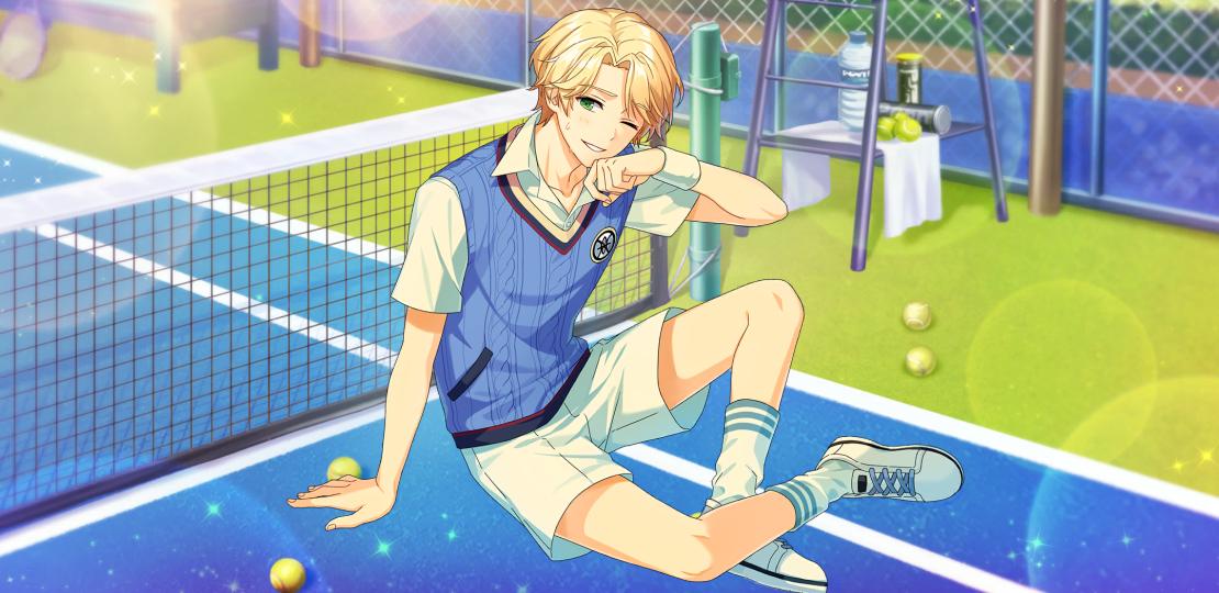 1boy afterl!fe ball blonde_hair fingernails green_eyes looking_at_viewer louis_(afterl!fe) male_focus official_art open_mouth second-party_source short_hair short_sleeves sitting smile solo sportswear sweater_vest teeth tennis_ball tennis_court tennis_uniform vest