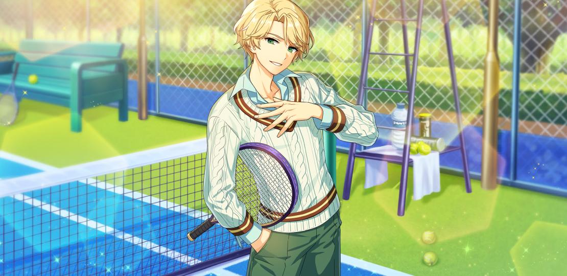1boy afterl!fe blonde_hair facing_away fingernails green_eyes long_sleeves looking_at_viewer louis_(afterl!fe) male_focus official_art playing_sports racket second-party_source short_hair smile solo sweater teeth tennis_court tennis_racket