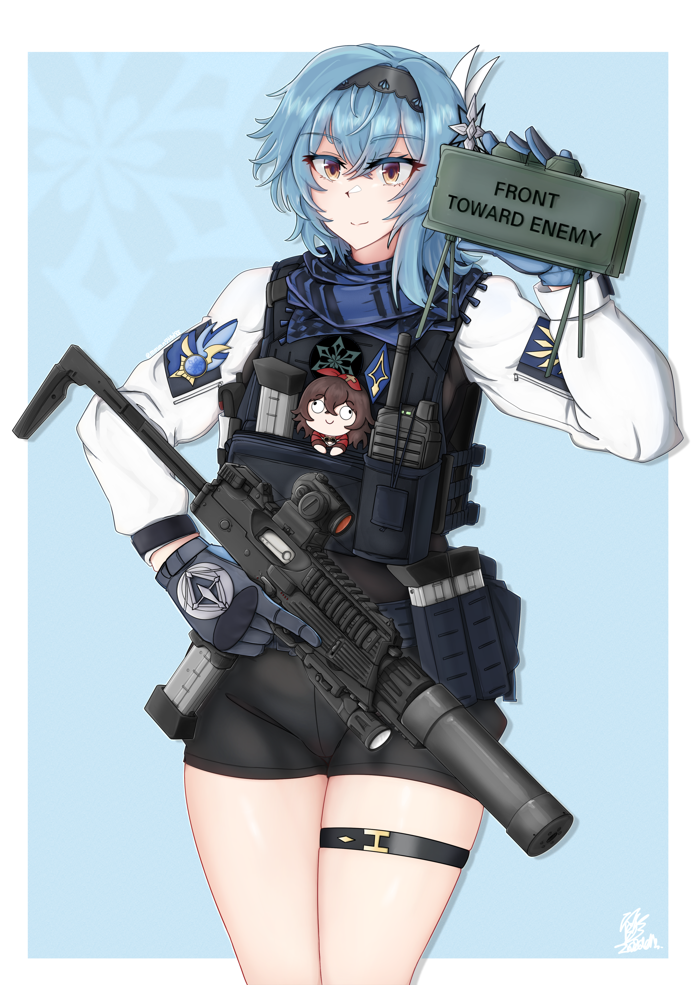 1girl absurdres amber_(genshin_impact) b&t_mp9 bike_shorts black_hairband black_shorts blue_gloves blue_hair blue_scarf bulletproof_vest character_doll claymore_(mine) doll eula_(genshin_impact) explosive genshin_impact gloves gun hair_between_eyes hairband highres holding holding_gun holding_weapon long_sleeves medium_hair mine_(weapon) mmmn540d88 multicolored_eyes purple_eyes scarf shirt shorts smile submachine_gun suppressor weapon white_shirt yellow_eyes