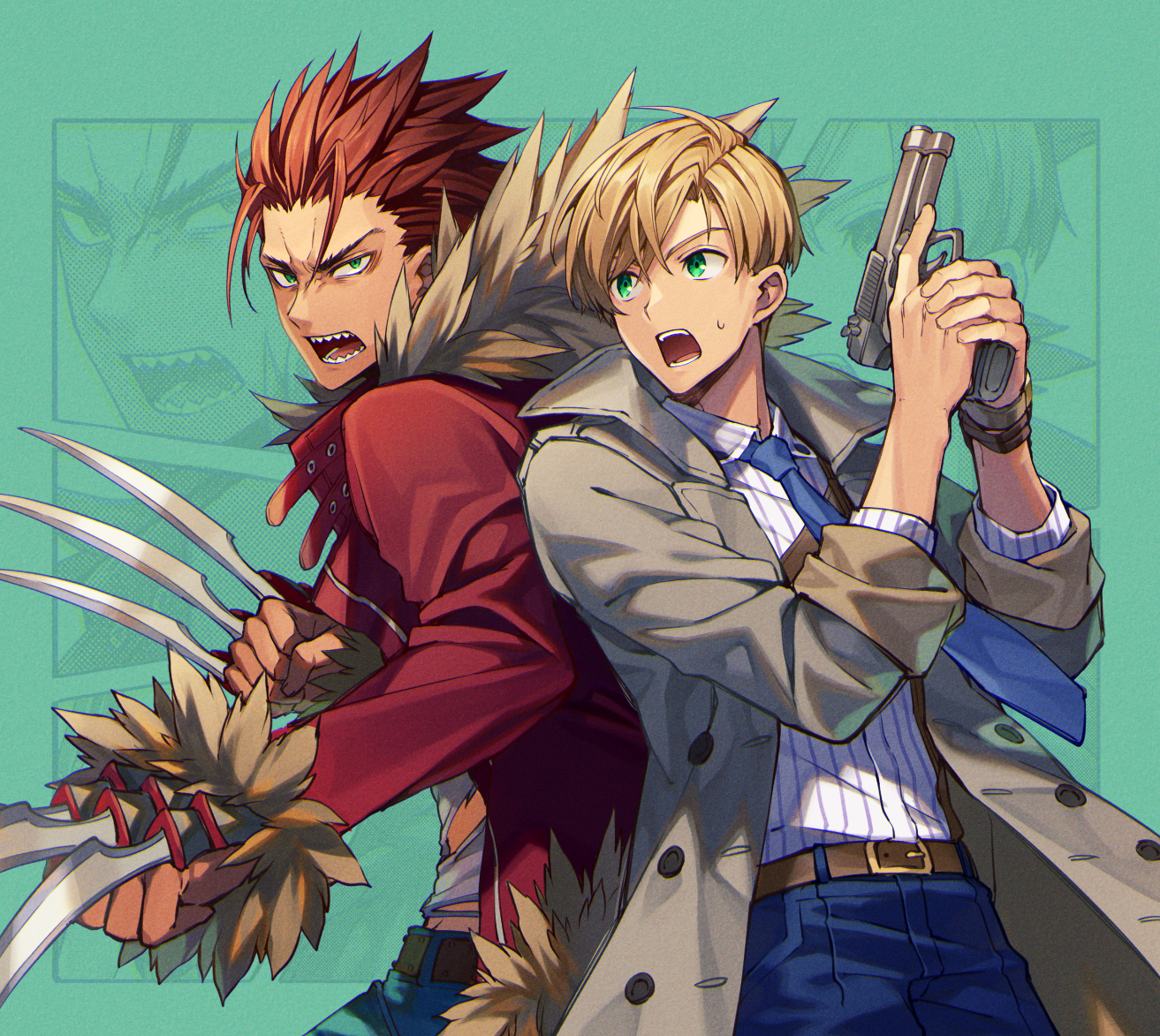 2boys aaron_(buddy_mission_bond) belt blonde_hair blue_pants buddy_mission_bond coat fur_collar green_eyes gun holding holding_gun holding_weapon luke_(buddy_mission_bond) male_focus multiple_boys necktie open_mouth pants red_hair sharp_teeth shirt spiked_hair striped_clothes striped_shirt sweatdrop teeth upper_body weapon yuzu_shio
