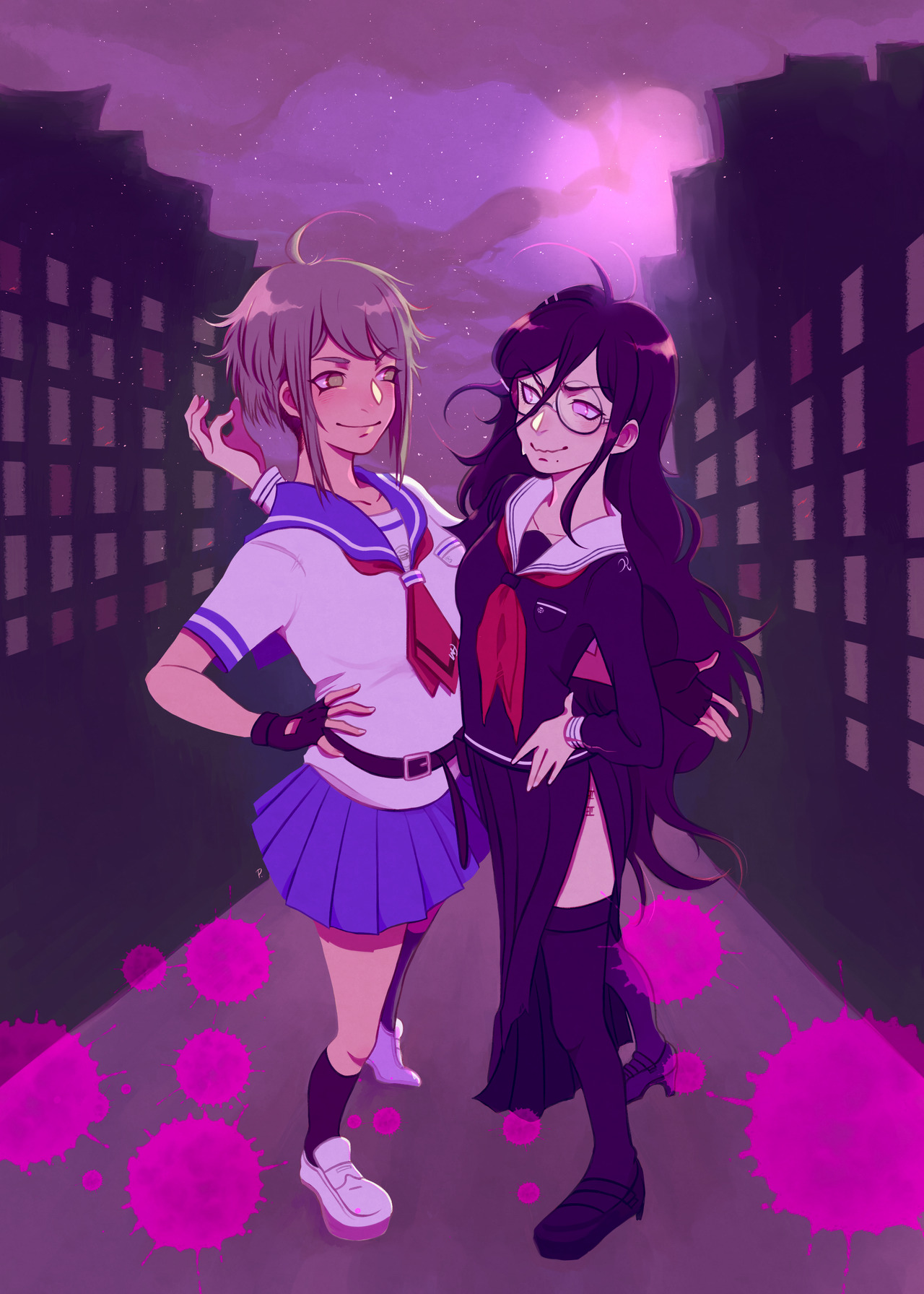 2girls ahoge arm_around_shoulder black_footwear black_socks blood blood_splatter blue_skirt blush body_writing brown_hair city cityscape closed_mouth collarbone danganronpa_(series) danganronpa_another_episode:_ultra_despair_girls dress ears female_focus fingerless_gloves fukawa_toko full_body gloves green_eyes hand_on_own_hip highres kneehighs long_hair looking_at_another looking_at_viewer multiple_girls naegi_komaru night nose pink_blood pleated_dress pleated_skirt purple_dress purple_eyes purple_footwear purple_hair purple_thighhighs red_neckwear red_scarf scar scarf school_uniform serafuku shirt skirt sky smile socks standing star_(sky) starry_sky tally thighhighs white_footwear white_serafuku white_shirt yuri