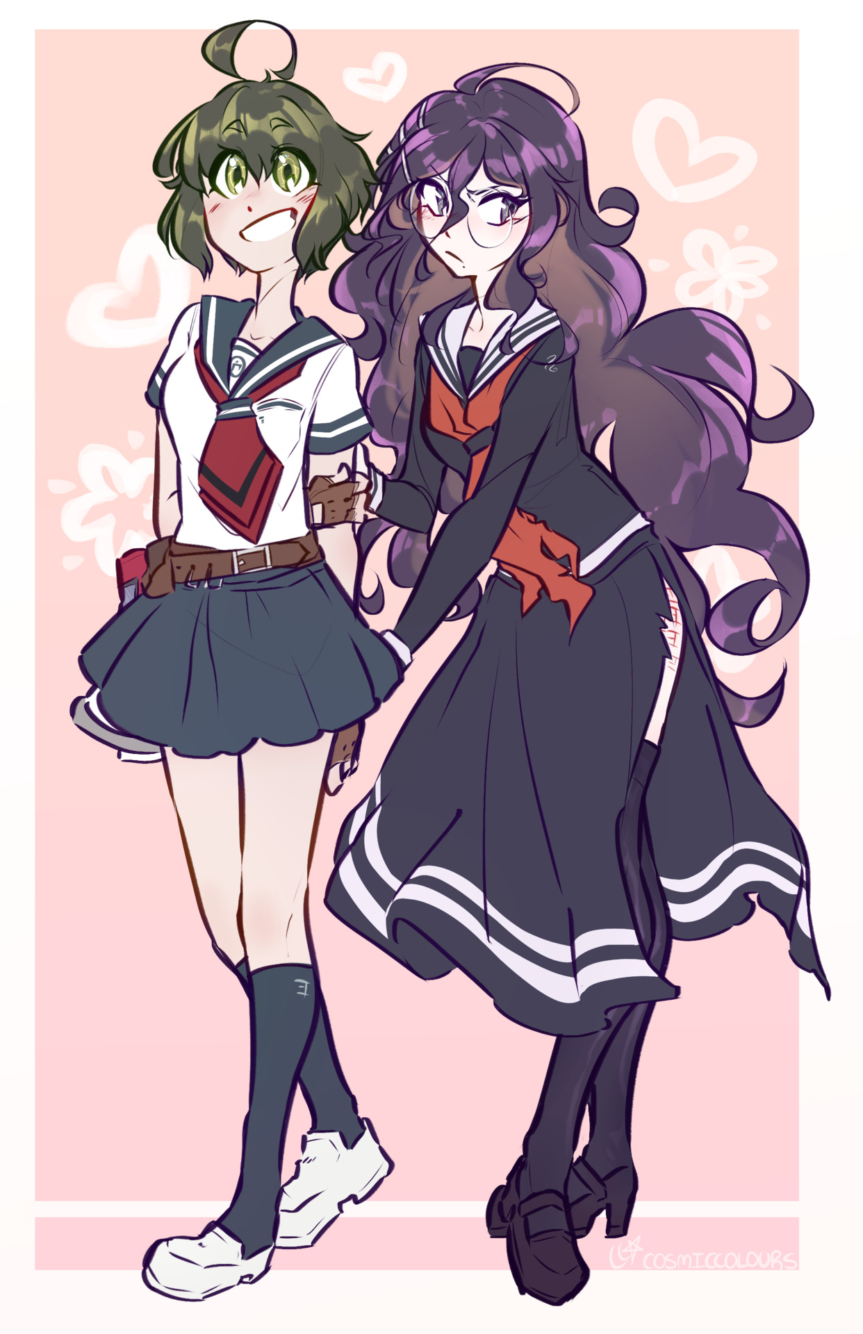 2girls ahoge black_dress black_footwear black_thighhighs blue_skirt blush body_writing kneehighs closed_mouth collarbone danganronpa_(series) danganronpa_another_episode:_ultra_despair_girls dress female_focus fukawa_toko full_body glasses green_eyes green_hair grin heart highres holding_hands leather_belt long_hair medium_hair multiple_girls naegi_komaru open_mouth pink_background pleated_dress pleated_skirt purple_eyes purple_hair red_scarf round_eyewear scar scarf shirt short_sleeves simple_background skirt smile tally teeth thighhighs white_footwear white_shirt yuri