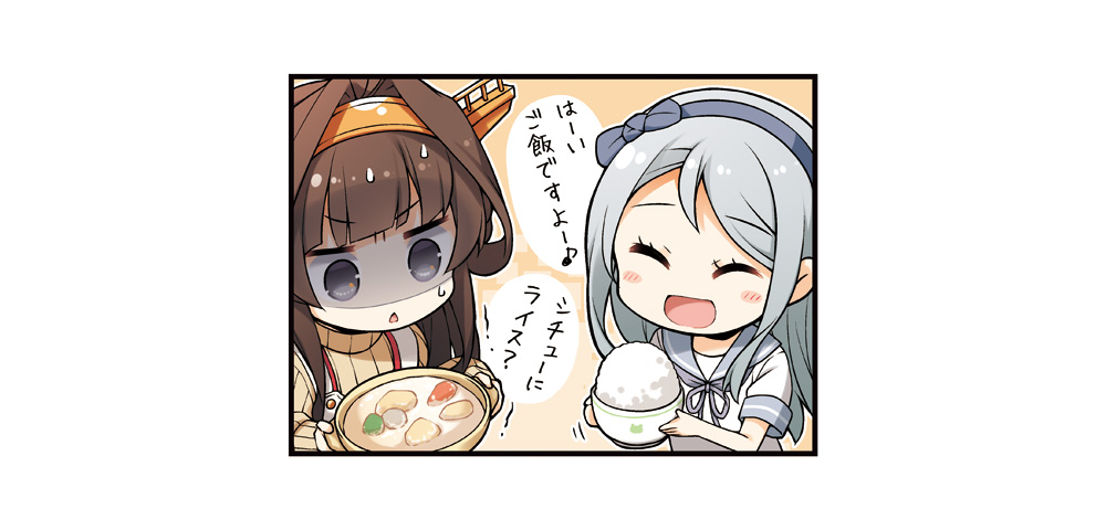2girls black_hairband blush bowl brown_hair eighth_note closed_eyes grey_eyes grey_hair grey_sailor_collar hairband headgear holding holding_bowl kantai_collection kongou_(kancolle) kongou_kai_ni_(kancolle) long_hair long_sleeves motion_lines multiple_girls musical_note open_mouth ribbed_sweater rice sagiri_(kancolle) sailor_collar school_uniform serafuku shaded_face short_sleeves smile sweater translation_request yellow_sweater yume_no_owari