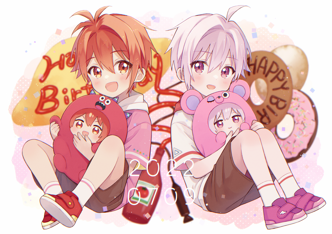2boys aged_down blush brothers child happy_birthday idolish7 kujo_tenn looking_at_viewer male_focus multiple_boys nanase_riku open_mouth pink_hair purple_eyes red_eyes red_hair short_hair siblings sitting smile tayako twins white_background