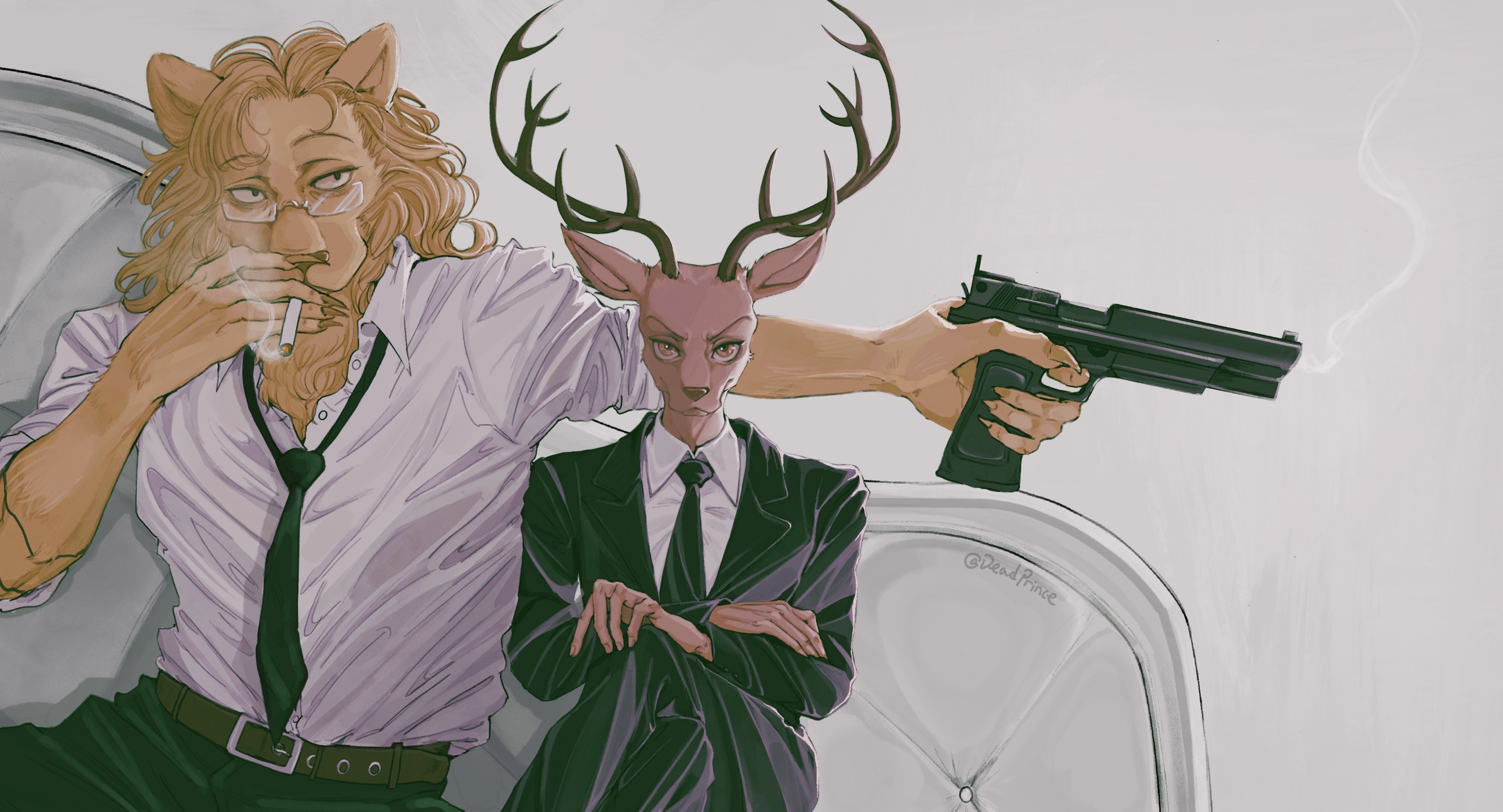 2boys antlers beastars belt between_fingers black_jacket black_necktie black_pants brown_eyes cigarette closed_mouth collared_shirt couch crossed_legs deadprince deer_boy dress_shirt finger_on_trigger fingernails formal_clothes furry furry_male glasses gun handgun highres holding holding_cigarette holding_gun holding_weapon horns ibuki_(beastars) jacket lion_boy long_sleeves looking_at_viewer looking_away louis_(beastars) male_focus mouth_hold multiple_boys necktie outstretched_arm pants scar scar_on_arm sharp_fingernails shirt sideways_glance simple_background sleeves_rolled_up smoke smoke_trail smoking suit upper_body weapon white_shirt