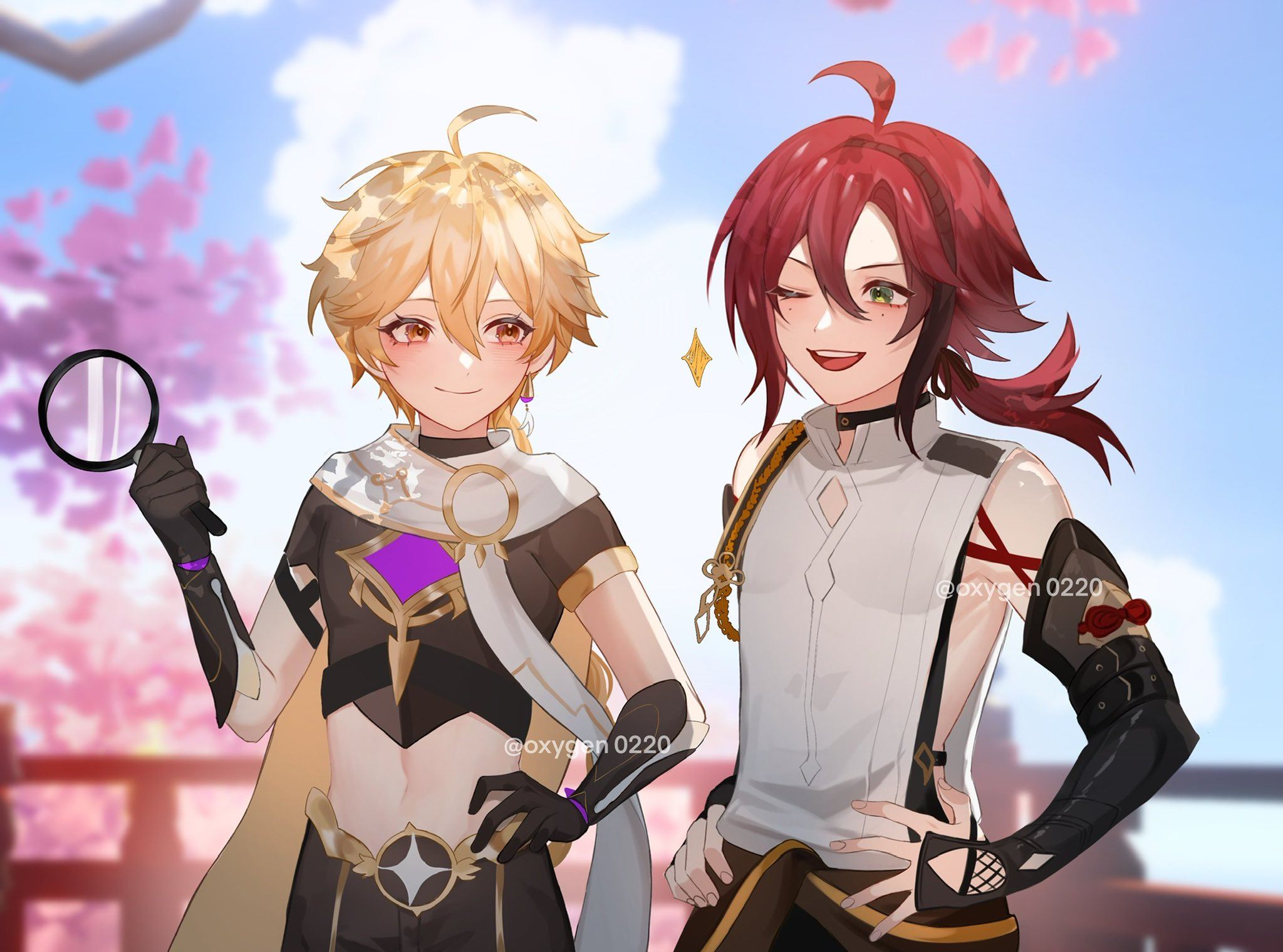 2boys aether_(genshin_impact) ahoge armor bare_shoulders blonde_hair cape closed_eyes crop_top earrings genshin_impact gloves green_eyes highres japanese_armor jewelry looking_at_viewer magnifying_glass male_focus midriff mole mole_under_eye multicolored_hair multiple_boys navel one_eye_closed open_mouth orange_cape oxygen_(0220) red_hair shikanoin_heizou single_earring smile streaked_hair yellow_eyes