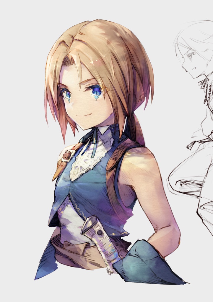1boy bare_shoulders blonde_hair blue_eyes blue_vest dagger final_fantasy final_fantasy_ix frilled_shirt_collar frills grey_background knife low_ponytail male_focus neck_ribbon parted_bangs ponytail ribbon sheath sheathed shirt short_hair_with_long_locks sketch sleeveless sleeveless_shirt smile solo strap upper_body vest weapon white_shirt wrist_cuffs yasushi_hasegawa zidane_tribal