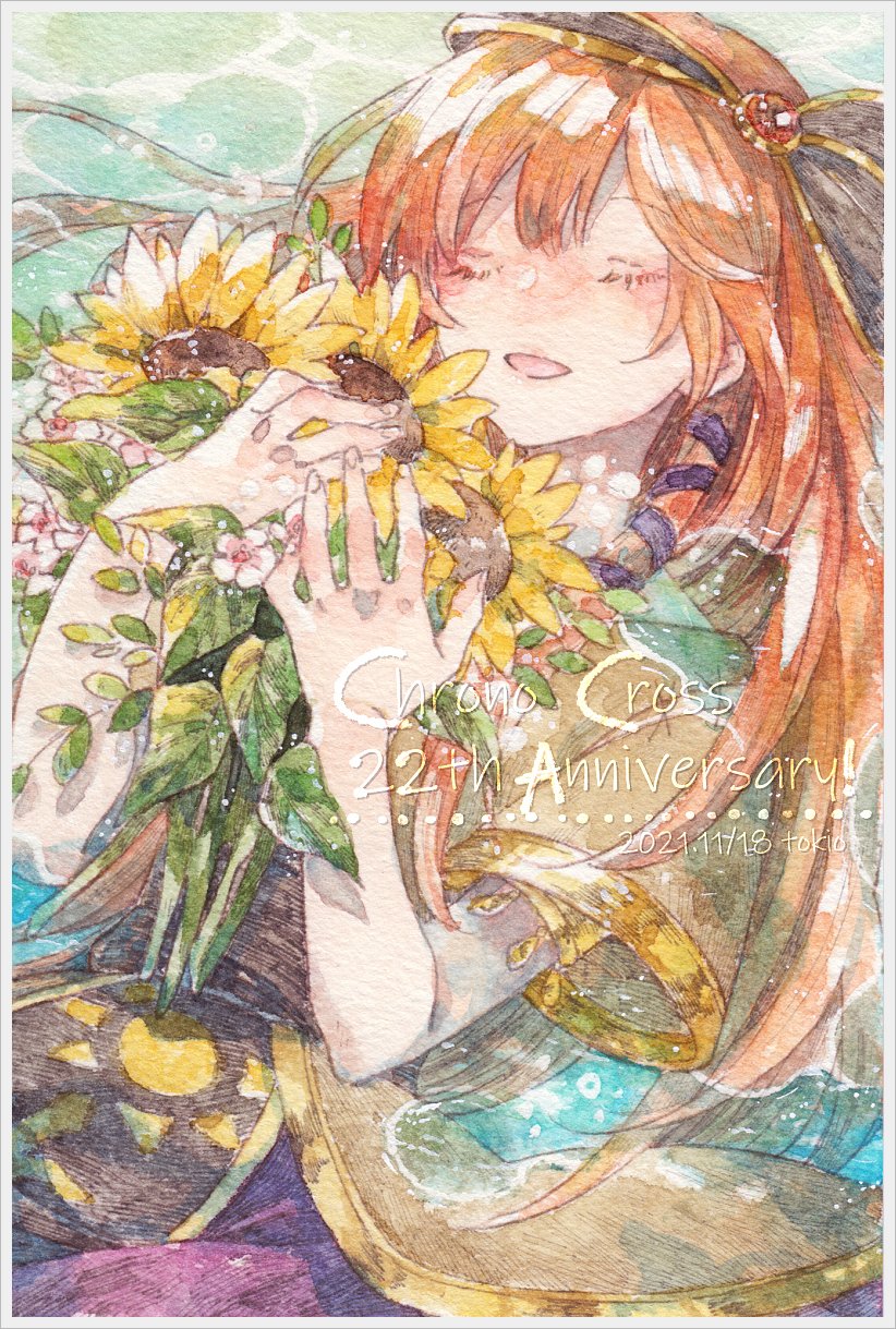 1girl afloat armlet bouquet brown_tunic chrono_cross closed_eyes dress flower hair_between_eyes hair_ornament hair_ribbon hairband highres holding holding_bouquet jewelry leena_(chrono_cross) long_hair ocean open_mouth orange_hair painting_(medium) partially_submerged purple_dress purple_ribbon ribbon sidelocks sunflower tokio_(okt0w0) traditional_media tunic upper_body watercolor_(medium)