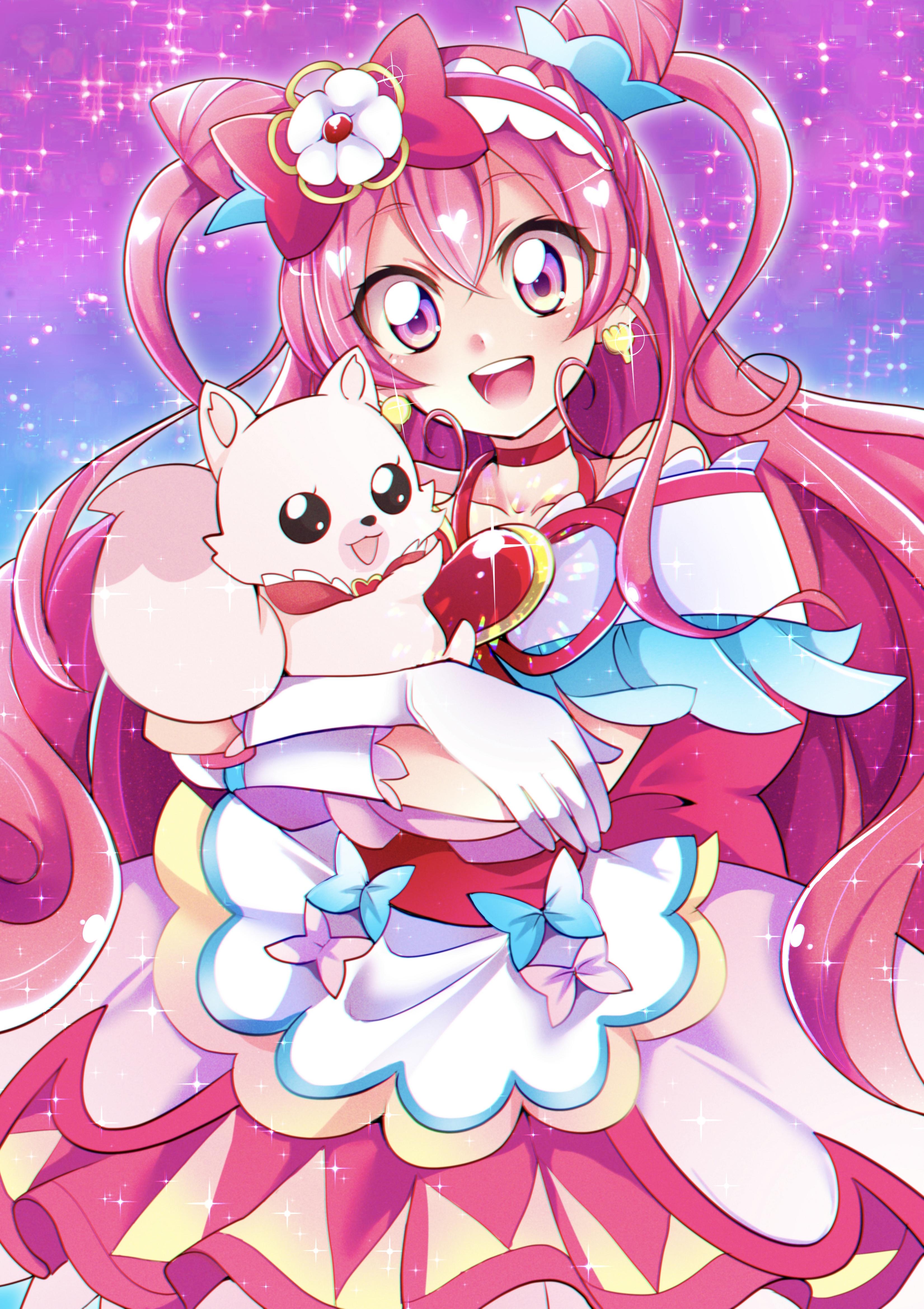1girl :d absurdres animal blue_bow bow choker cone_hair_bun cure_precious delicious_party_precure dress earrings floating_hair gloves hair_between_eyes hair_bow hair_bun highres holding holding_animal jewelry kome-kome layered_dress long_hair looking_at_viewer mitsuki_tayura open_mouth pink_bow pink_eyes pink_hair precure red_bow red_choker smile solo standing very_long_hair white_gloves