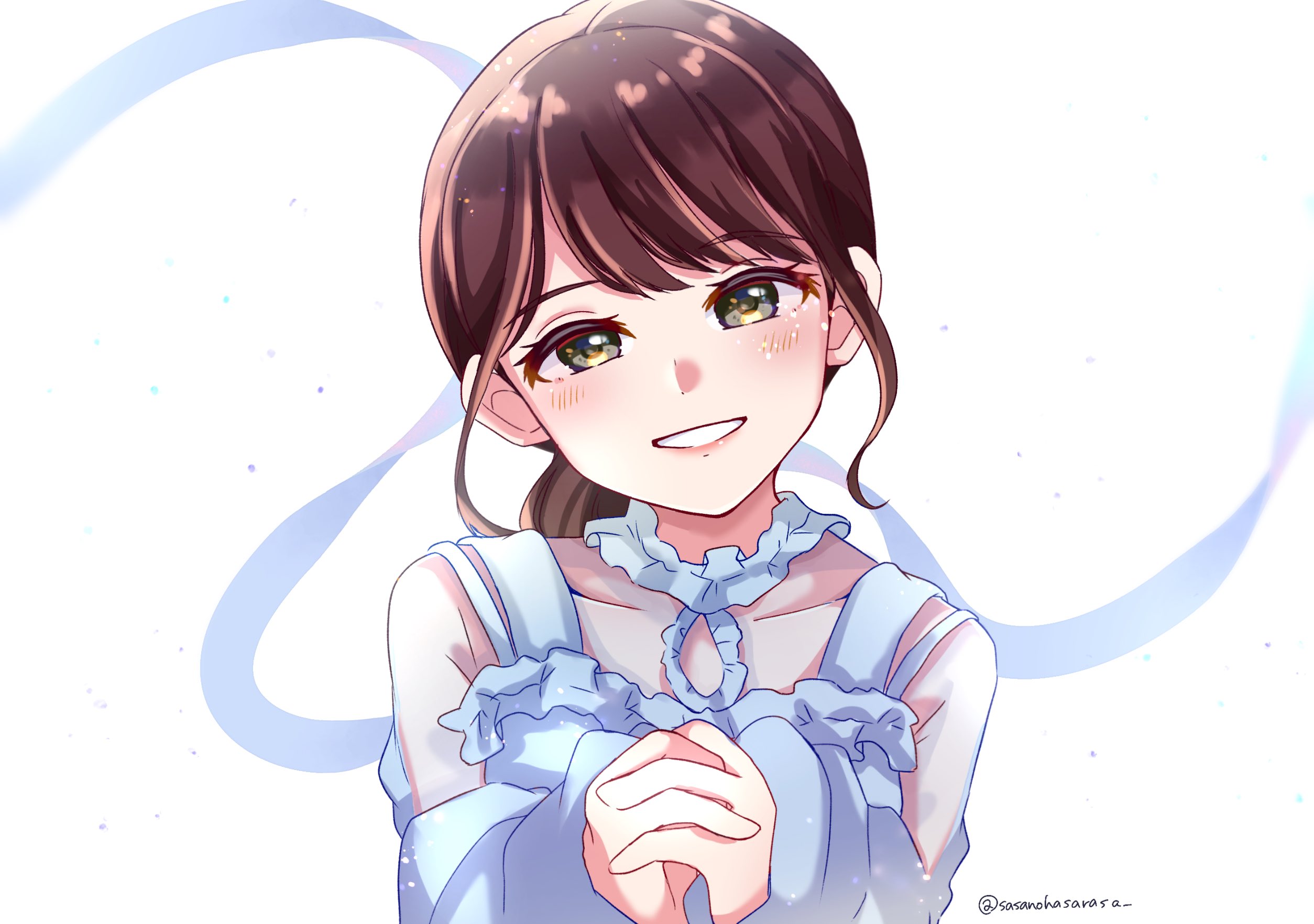 1girl aida_rikako birthday blue_ribbon brown_hair commentary highres long_hair looking_at_viewer low_ponytail ponytail real_life ribbon sasakura_sakura sidelocks smile solo twitter_username upper_body voice_actor white_background yellow_eyes