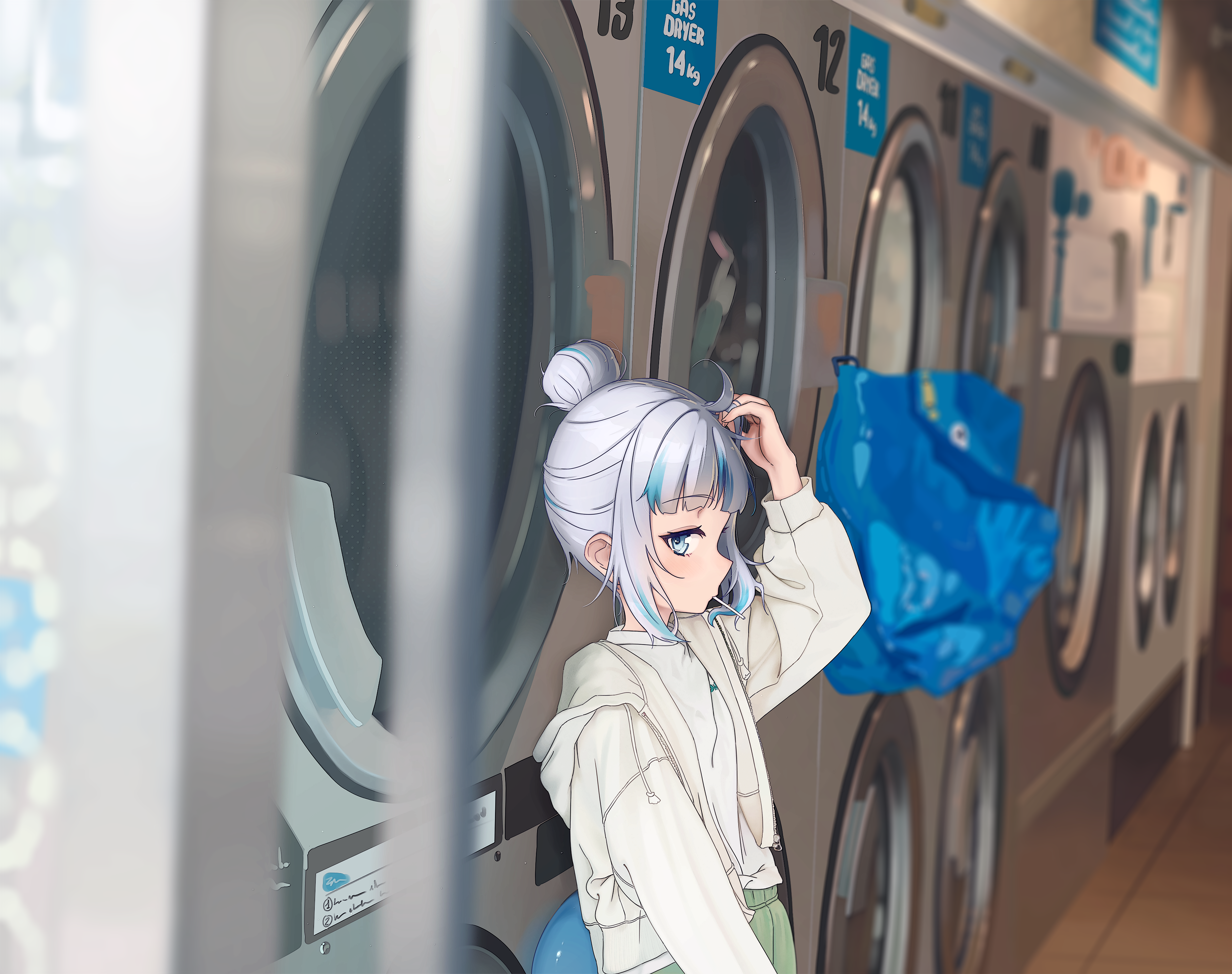 1girl absurdres ahoge arm_up blue_eyes candy food gawr_gura grey_hair hair_bun highres hololive hololive_english hood hood_down hooded_jacket indoors jacket lollipop long_sleeves looking_at_viewer lucasyecla99 mouth_hold open_clothes open_jacket shirt sidelocks sideways_glance single_hair_bun solo virtual_youtuber washing_machine white_shirt
