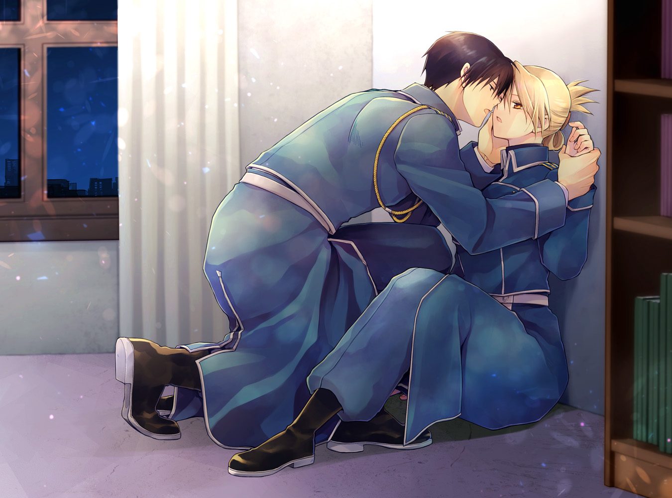 against_wall amestris_military_uniform black_footwear black_hair blonde_hair blue_jacket blue_pants couple eye_contact full_body fullmetal_alchemist hetero holding_another's_wrist imminent_kiss indoors jacket long_sleeves looking_at_another military_jacket on_one_knee open_mouth orange_eyes pants riza_hawkeye roy_mustang short_hair takafuji_yuna