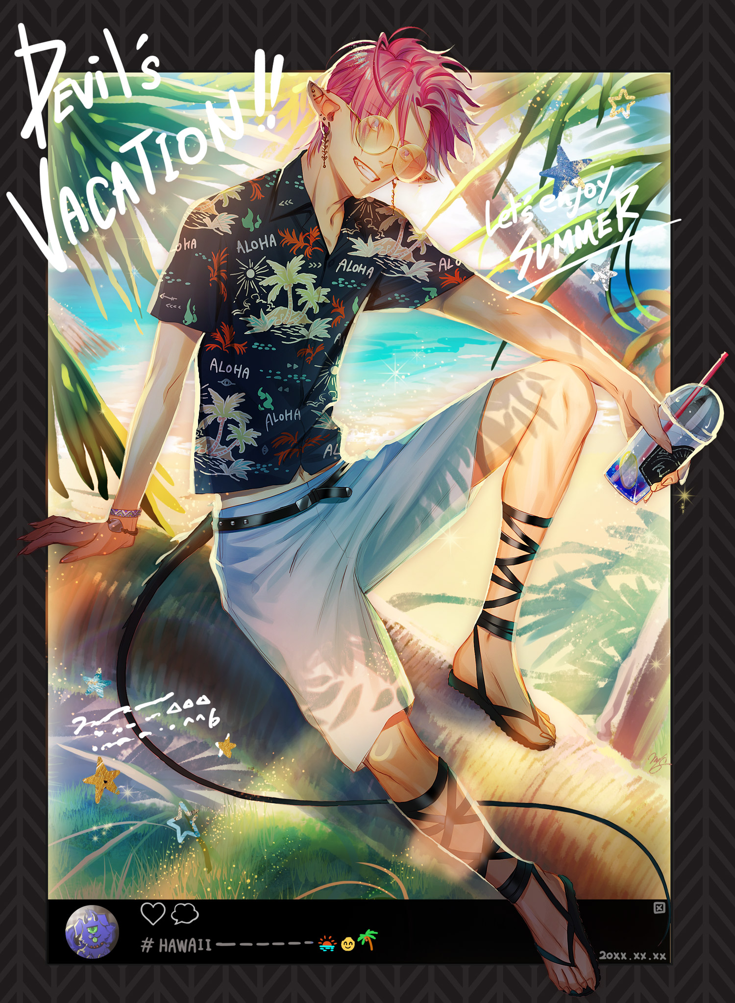1boy antenna_hair arm_support belt bishounen collared_shirt day drink ear_piercing earrings glasses head_tilt highres holding holding_drink jewelry looking_at_viewer m/g male_focus original piercing pink_hair pointy_ears sandals shirt short_hair short_sleeves smile solo sparkle summer_uniform sunglasses