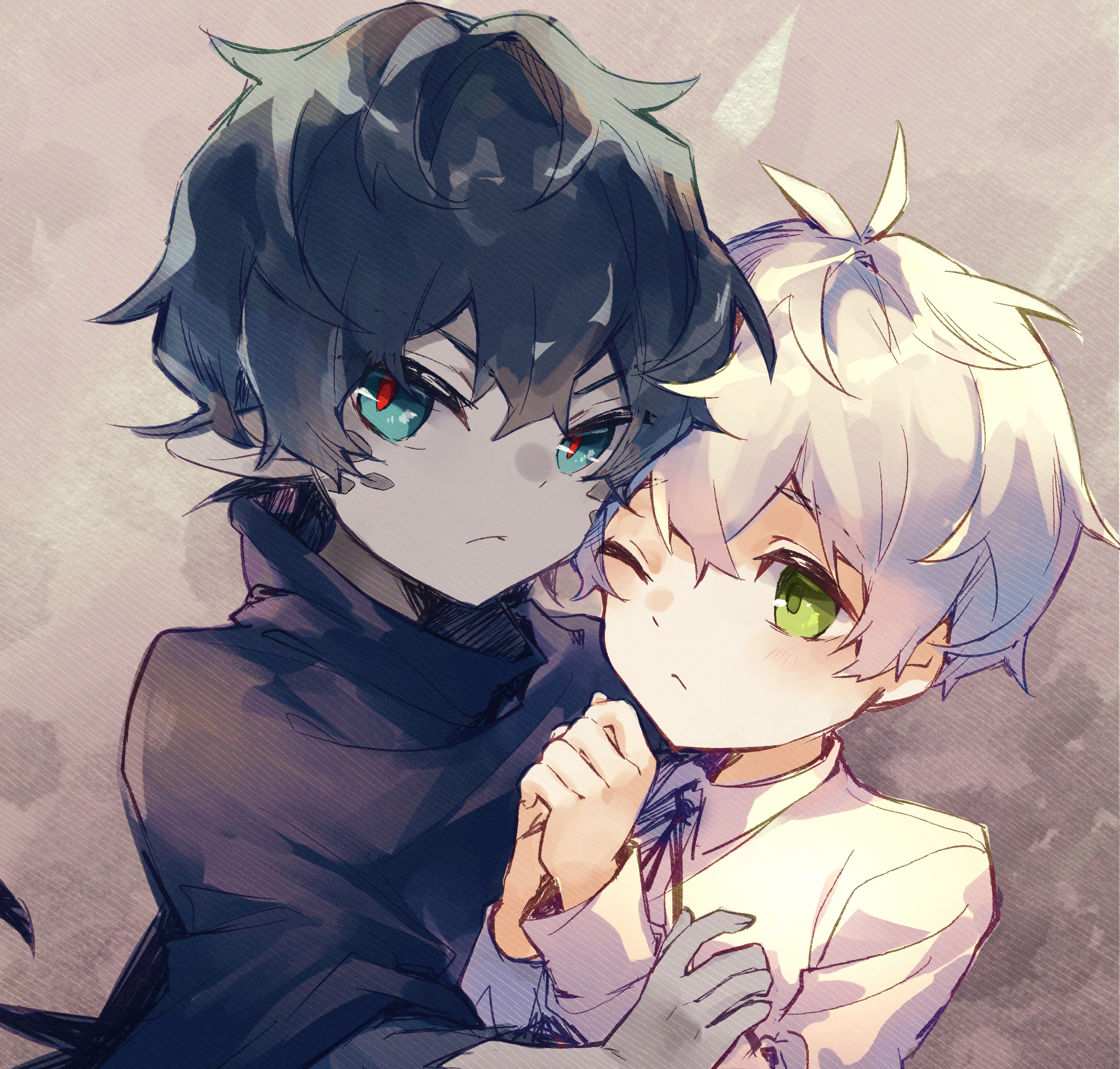 2boys angry arknights aruke0 bishounen black_shirt blue_eyes closed_mouth faust_(arknights) highres male_focus mephisto_(arknights) multiple_boys one_eye_closed own_hands_together pointy_ears red_eyes ribbon shirt upper_body white_hair white_shirt