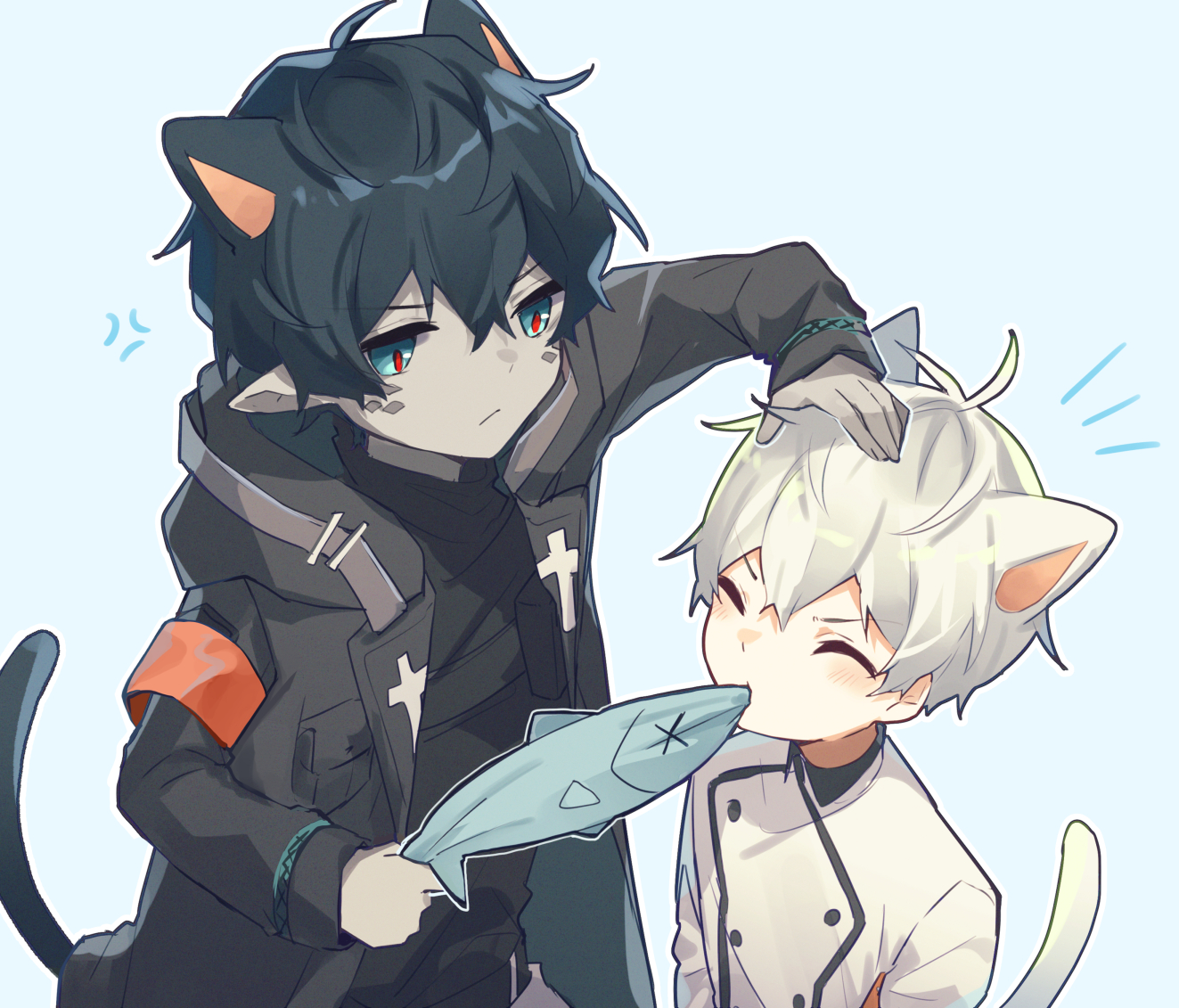 2boys ahoge anger_vein animal_ears arknights armband aruke0 bishounen black_hair black_shirt blue_background cat_boy cat_ears cat_tail closed_mouth coat faust_(arknights) fish hand_on_another's_head male_focus mephisto_(arknights) multiple_boys pointy_ears red_armband shirt short_hair simple_background tail upper_body white_hair white_shirt