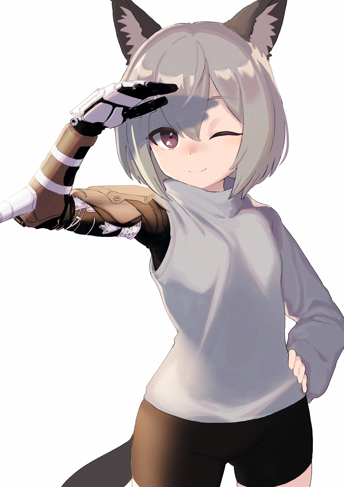1girl amputee bike_shorts borrowed_character commission female_focus grey_hair hand_on_own_hip highres lolicom medium_hair one_eye_closed original prosthesis prosthetic_arm purple_eyes shadow single_sleeve smile solo
