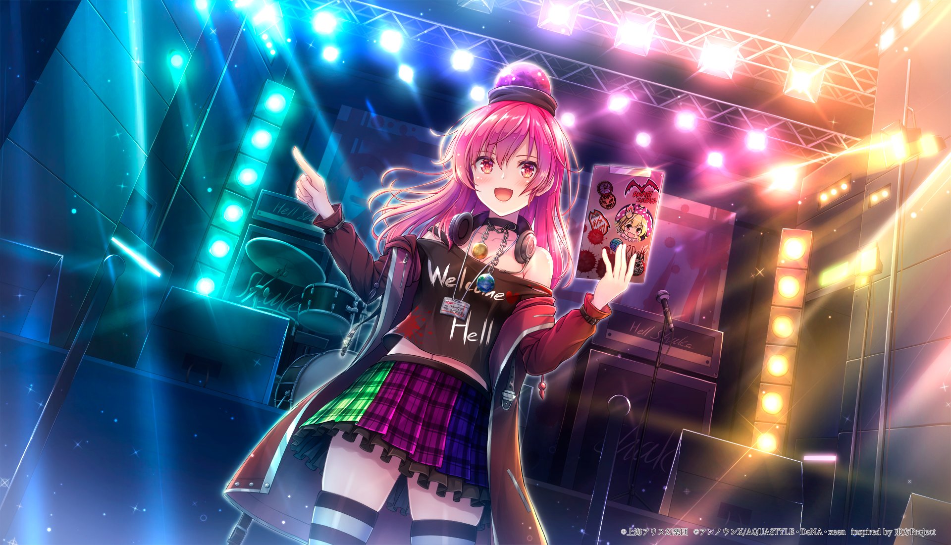 1girl alternate_hair_color alternate_hair_length alternate_hairstyle artist_request bare_shoulders belt black_belt black_choker black_hat black_shirt black_thighhighs blonde_hair blush blush_stickers breasts chain choker clothes_writing clownpiece coat collarbone commentary_request copyright_notice drum earth_(ornament) frills green_skirt grey_thighhighs hair_between_eyes hands_up hat headphones heart heart_print hecatia_lapislazuli highres instrument jester_cap lamp light long_hair long_sleeves looking_away medium_breasts microphone moon_(ornament) multicolored_skirt navel neck_ruff off-shoulder_shirt off_shoulder open_clothes open_coat open_mouth pink_hair pink_hat pink_skirt plaid_clothes plaid_skirt pointing polka_dot puffy_long_sleeves puffy_sleeves purple_skirt red_coat red_eyes shirt short_sleeves silver_chain skirt smile solo sparkle speaker standing sticker striped_clothes striped_thighhighs t-shirt thighhighs tongue touhou touhou_danmaku_kagura underworld_(ornament) wall
