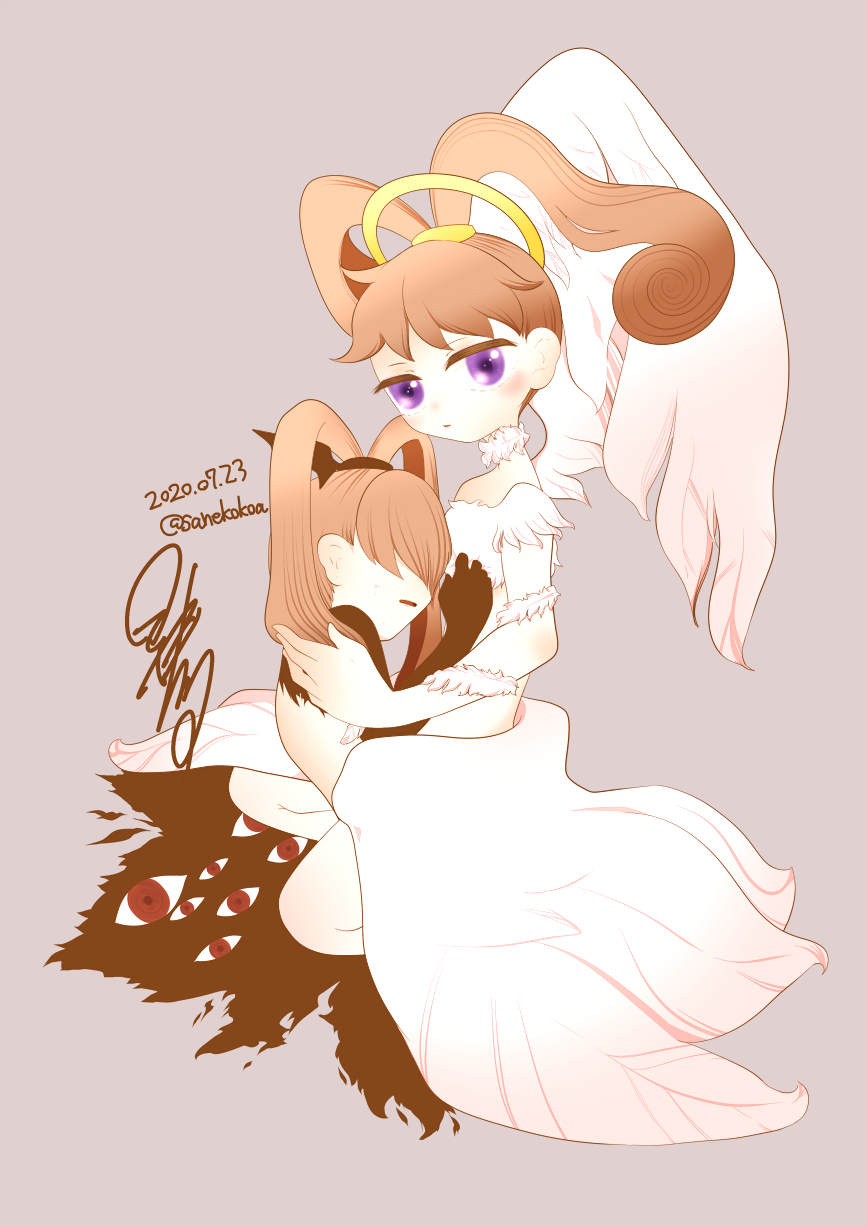 1girl amano_nene_(digimon_xros_wars) corruption dark_persona digimon dual_persona halo highres hug luminamon luminamon_(nene_ver.) possessed possession purification shademon shademon_(nene_ver.) shadow twintails wings