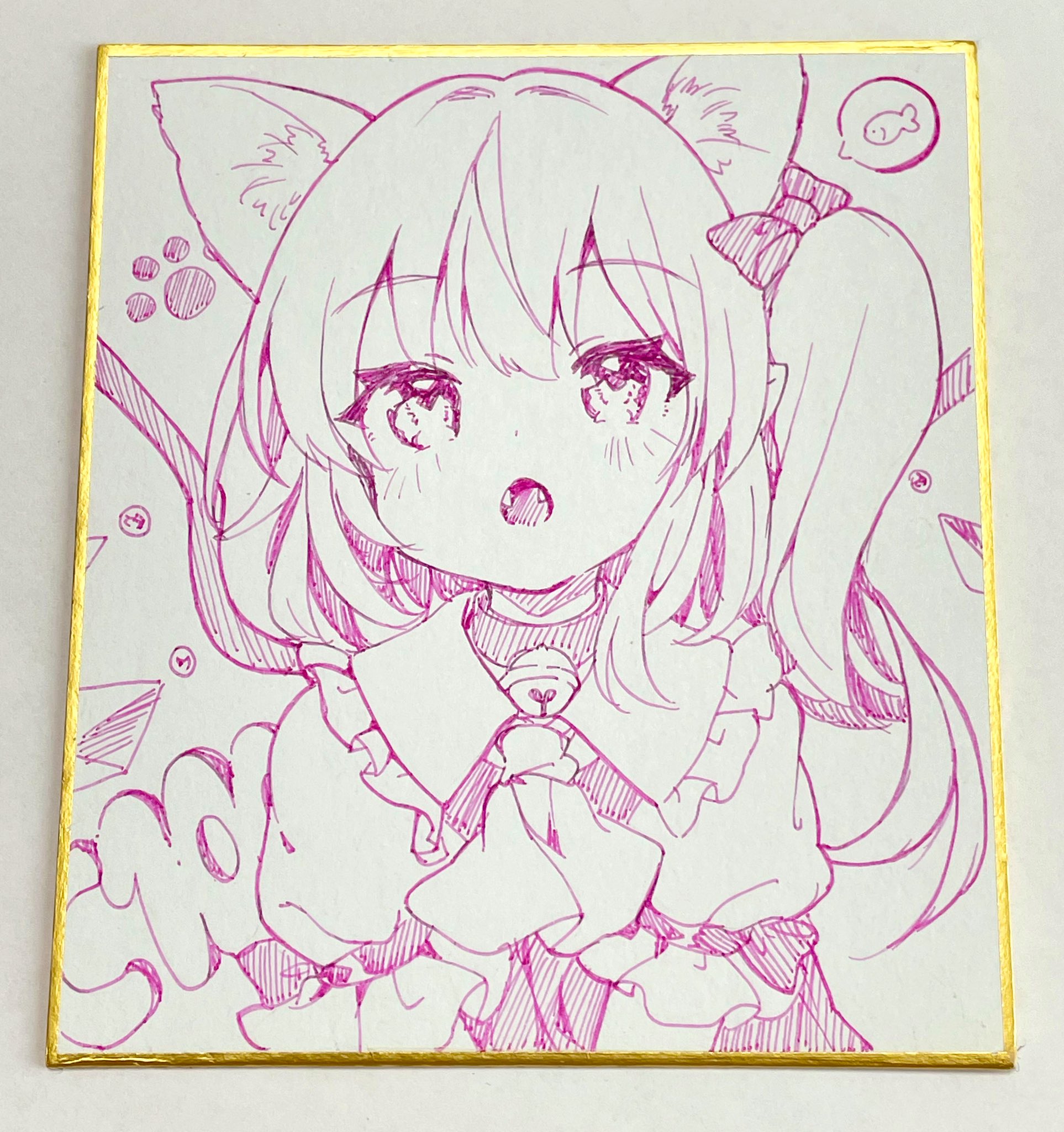 1girl animal_ears ascot bell bow cat_ears collared_shirt comiket_100 crystal fangs flandre_scarlet frilled_shirt_collar frills hair_bow hatching_(texture) highres linear_hatching looking_up medium_hair mimi_(mimi_puru) monochrome neck_bell one_side_up photo_(medium) portrait puffy_short_sleeves puffy_sleeves shikishi shirt short_sleeves solo speech_bubble touhou traditional_media vest white_shirt wings