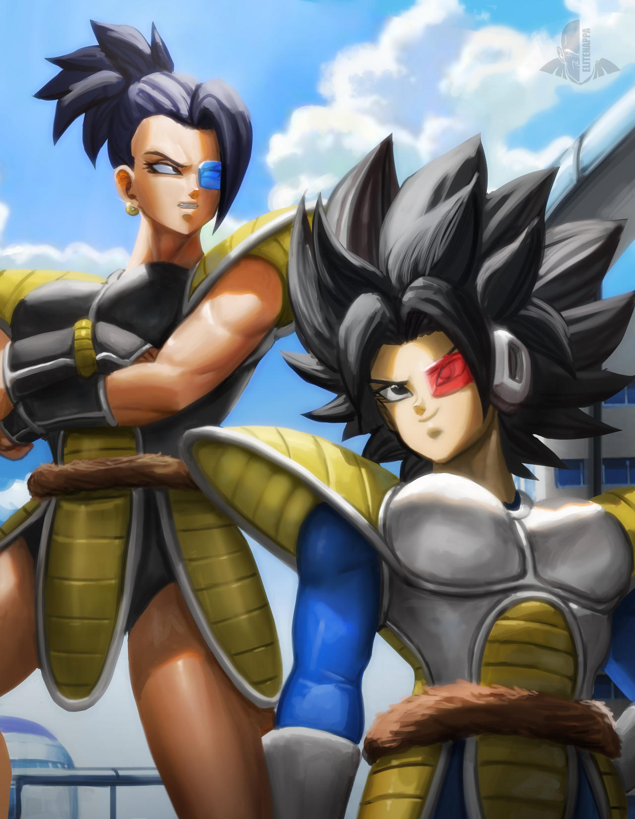 2girls armor black_eyes black_hair blue-tinted_eyewear brown_eyes caulifla city cloud cosplay crossed_arms dragon_ball dragonball_z earrings elite_nappa female_focus gloves grin highres jewelry kale_(dragon_ball) looking_to_the_side monkey_tail multiple_girls muscular muscular_female nappa nappa_(cosplay) red-tinted_eyewear saiyan saiyan_armor scouter sky sleeveless smile smirk spiked_hair tagme tail tinted_eyewear vegeta vegeta_(cosplay) white_gloves