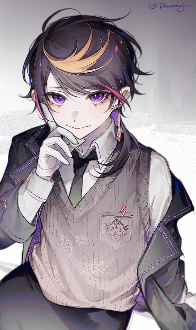 1boy black_hair black_jacket black_necktie blonde_hair brown_vest chinese_commentary collared_shirt colored_inner_hair commentary_request cowboy_shot earrings emblem from_above gloves grey_background hand_on_own_face hand_up jacket jewelry long_sleeves looking_at_viewer male_focus multicolored_hair necktie nijisanji nijisanji_en object_in_pocket off_shoulder pen pen_in_pocket pink_hair pocket purple_eyes purple_hair school_uniform shiguilinga shirt short_hair_with_long_locks shu_yamino sitting smile solo streaked_hair swept_bangs tassel tassel_earrings twitter_username vest virtual_youtuber white_gloves white_shirt