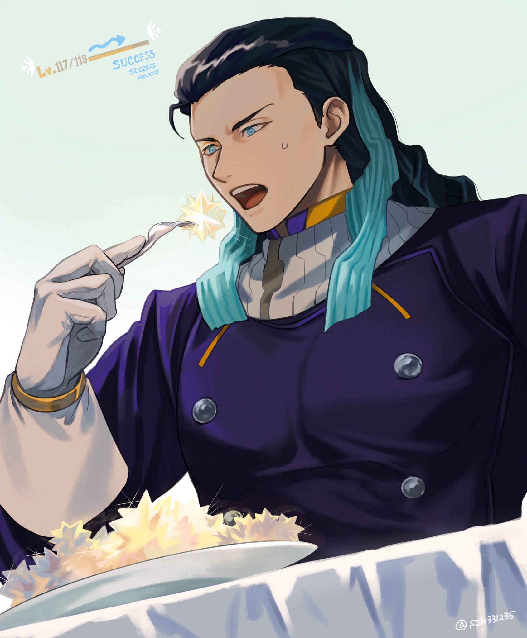 1boy text_background black_hair blue_eyes blue_hair bracelet commentary_request eating fate/grand_order fate_(series) fork gloves gradient_background gradient_hair high_collar highres holding holding_fork jacket jewelry blue_background long_hair long_sleeves looking_away male_focus multicolored_hair muscular muscular_male nikola_tesla_(fate) open_mouth plate solo sosaka sweat teeth twitter_username two-tone_hair upper_body upper_teeth_only white_background white_gloves