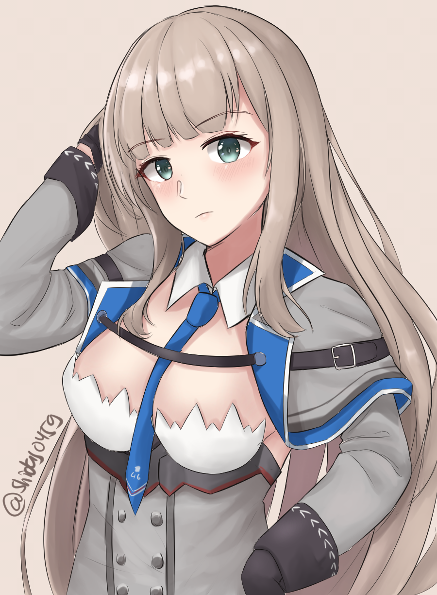 1girl between_breasts black_gloves blue_capelet blue_necktie breasts capelet dress gloves green_eyes grey_capelet grey_dress hair_down highres kantai_collection light_brown_hair long_hair maryland_(kancolle) medium_breasts multicolored_capelet necktie necktie_between_breasts shidas0459 solo upper_body
