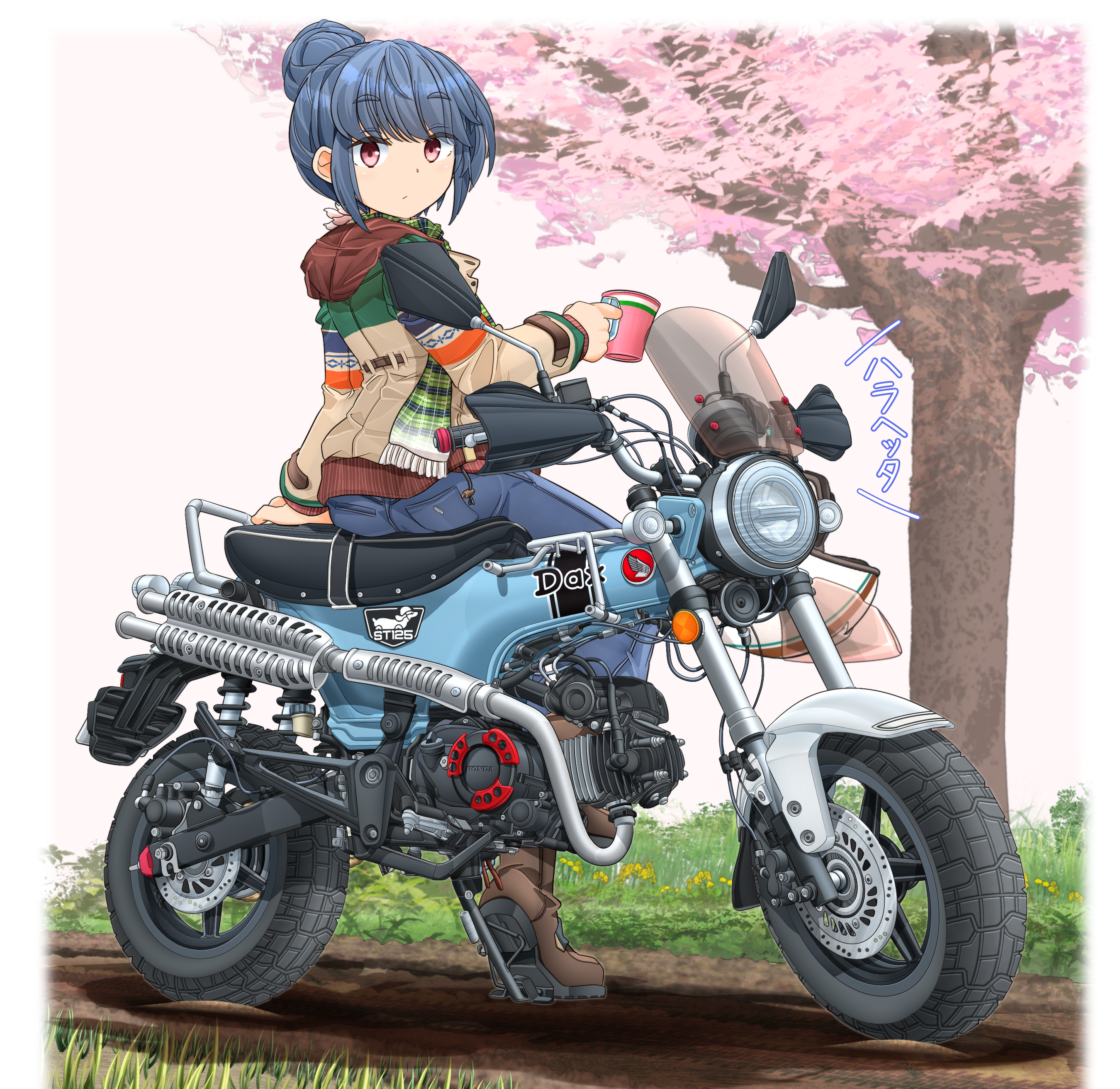1girl absurdres ankle_boots blue_hair blue_pants boots brown_boots brown_jacket closed_mouth commentary_request cup day denim fringe_trim from_behind green_scarf hair_bun highres holding holding_cup honda honda_dax hood hood_down hooded_jacket jacket jeans light_frown logo long_sleeves looking_at_viewer looking_back mikeran_(mikelan) motor_vehicle motorcycle on_motorcycle outdoors pants partial_commentary purple_eyes scarf shadow shima_rin short_hair sitting solo spring_(season) translated tree yurucamp