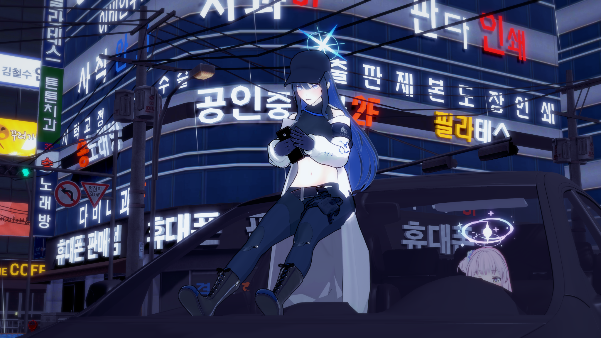 2girls blue_archive car dcinside highres korean_text mika_(blue_archive) mj0415 motor_vehicle multiple_girls saori_(blue_archive) water