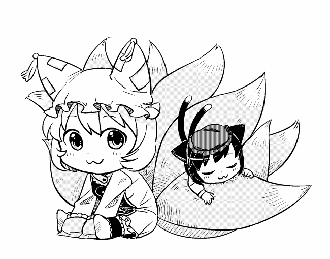 2girls :3 animal_ears animal_hat blush cat_ears cat_tail chen chibi closed_eyes closed_mouth commentary_request dress fox_ears fox_tail full_body greyscale grimay hat kitsune long_sleeves looking_at_viewer mob_cap monochrome multiple_girls multiple_tails nekomata non_porn short_hair simple_background sitting smile tabard tail touhou two_tails yakumo_ran