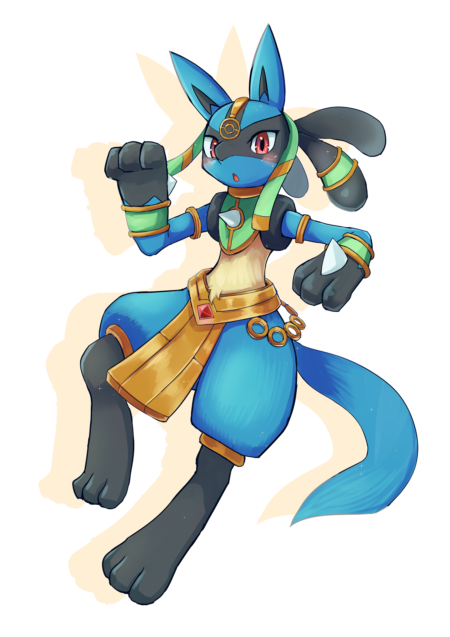 :o armlet blush chain commentary_request full_body gen_4_pokemon highres jewelry lucario lucario_(ruins) nintendo open_mouth pokemon pokemon_(creature) pokemon_unite red_eyes shigure_na_hito solo