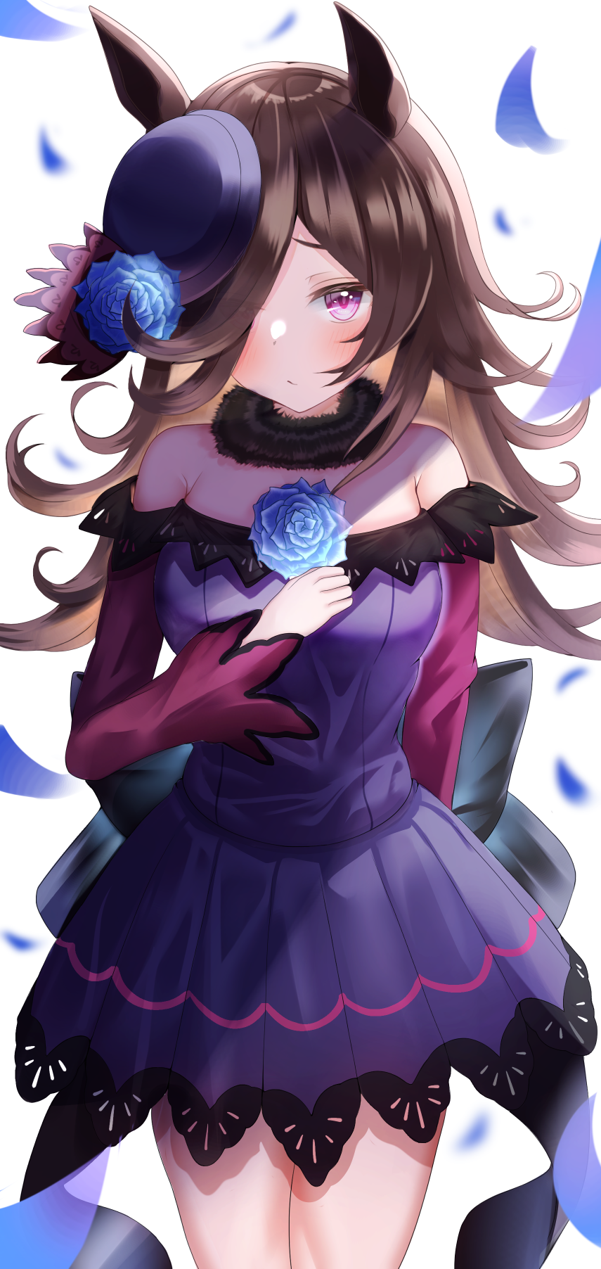 1girl animal_ears bare_shoulders blue_flower blue_hat blue_rose blush brown_hair cowboy_shot dress flipped_hair flower fur_collar hair_over_one_eye hand_on_own_chest hand_up hat hat_flower highres horse_ears horse_girl kaku_yone long_hair long_sleeves looking_at_viewer off-shoulder_dress off_shoulder purple_dress purple_eyes rice_shower_(umamusume) rose short_dress solo standing tilted_headwear umamusume