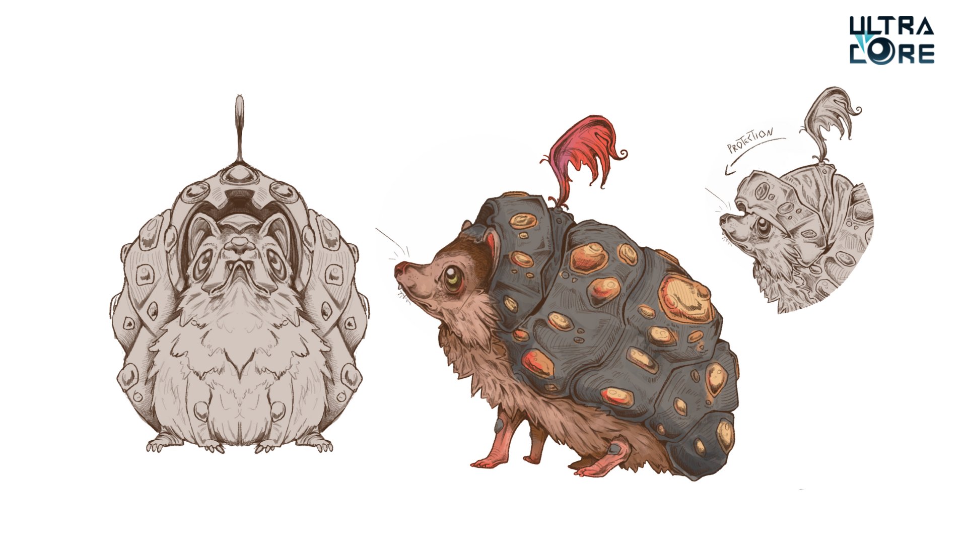 animal armor brown_eyes commentary english_commentary english_text from_side hedgehog highres looking_up multiple_views no_humans official_art simple_background ultracore white_background