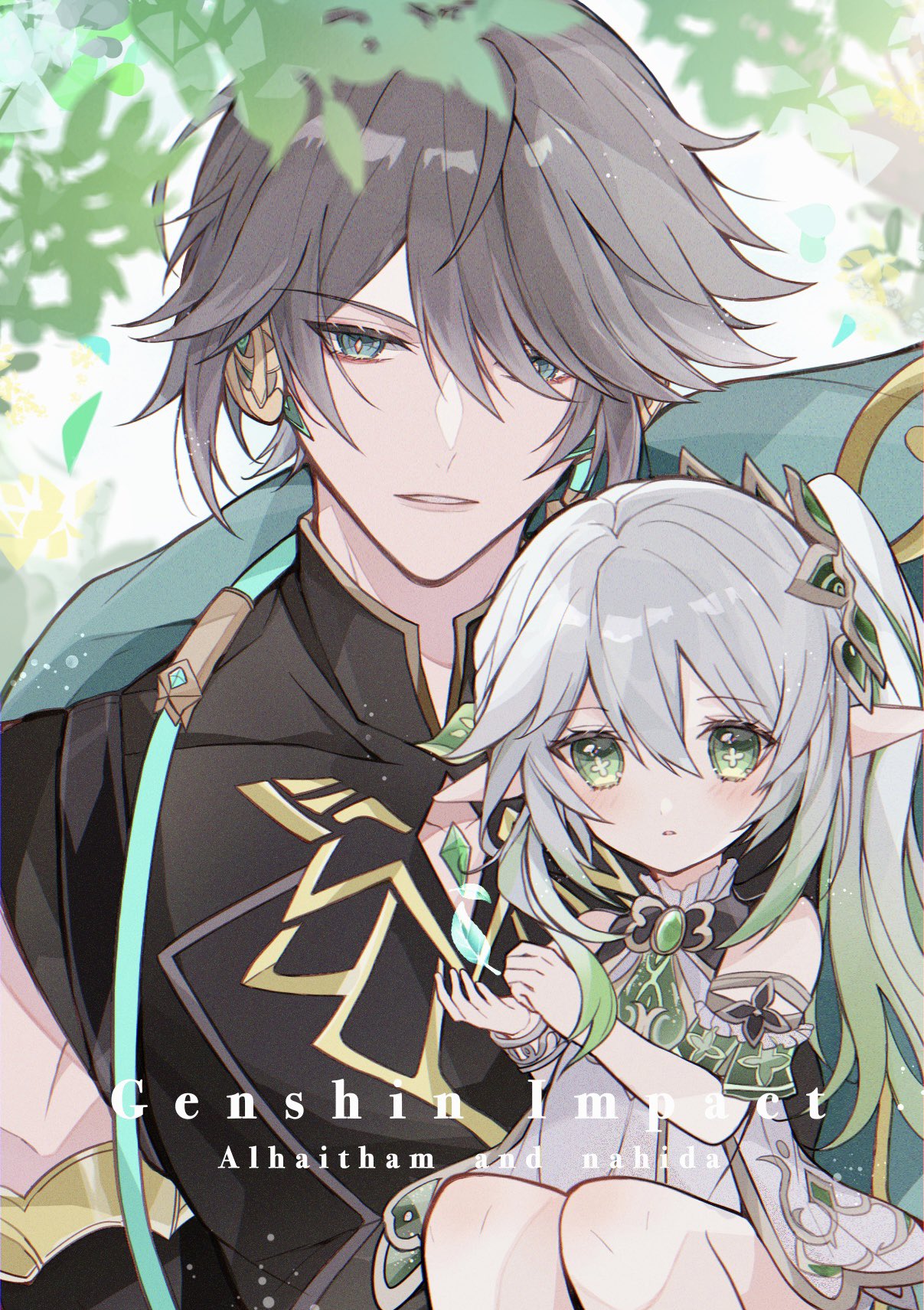 1boy 1girl alhaitham_(genshin_impact) aqua_eyes blue_cape bodysuit cape child commentary_request cross-shaped_pupils detached_sleeves dress ekua_piyo genshin_impact gradient_hair green_eyes green_hair green_sleeves grey_hair hair_ornament headset highres leaf_hair_ornament long_hair multicolored_hair nahida_(genshin_impact) pointy_ears side_ponytail symbol-shaped_pupils white_dress white_hair