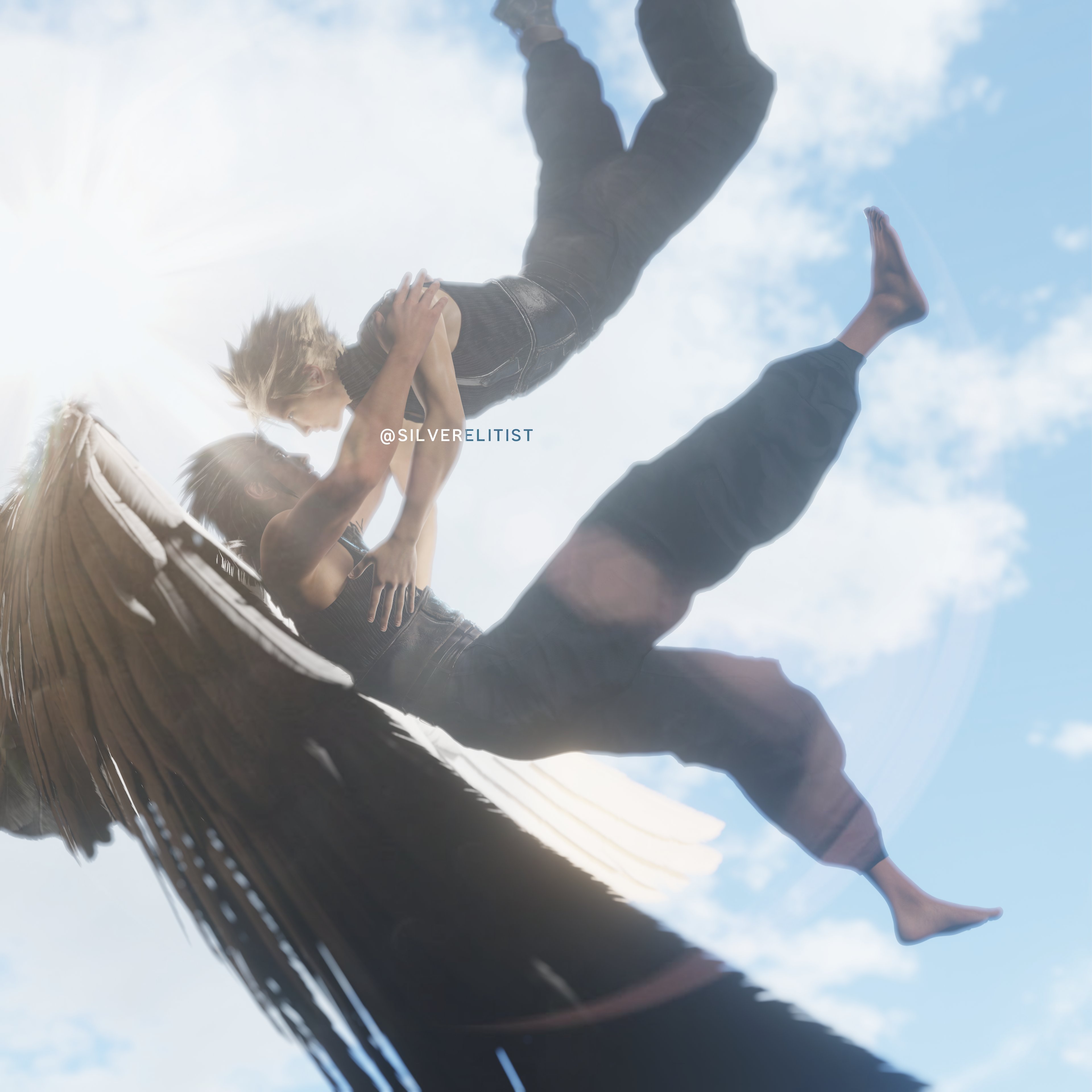 2boys 3d absurdres barefoot belt black_hair blonde_hair catching cloud_strife falling final_fantasy final_fantasy_vii final_fantasy_vii_remake highres lens_flare male_focus multiple_boys pants silverelitist sleeveless sleeveless_turtleneck spiked_hair square_enix suspenders turtleneck wings yaoi zack_fair