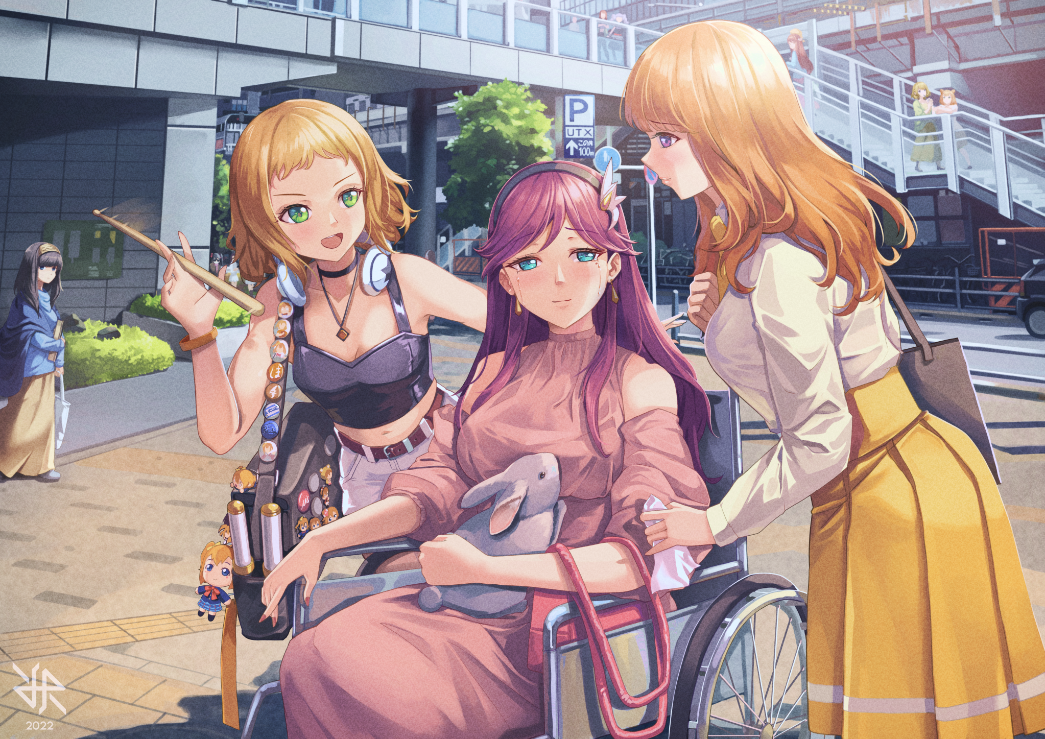 6+girls a-rise artist_logo bag bang_dream! bang_dream!_girls_band_party! breasts brown_hair building bush choker cleavage commentary crying crying_with_eyes_open drumsticks earrings green_eyes hairband headphones headphones_around_neck highres hiroki_ree holding holding_drumsticks jewelry kira_tsubasa logo long_hair long_skirt love_live! love_live!_school_idol_project matsunaga_maho medium_breasts midriff mole mole_under_eye multiple_girls navel necklace oohashi_ayuru purple_eyes purple_hair rabbit road_sign sakuragawa_megu short_hair shoulder_bag sidelocks sign sitting skirt small_breasts stairs tears todo_erena tree voice_actor_connection wheelchair yellow_skirt yuki_anju