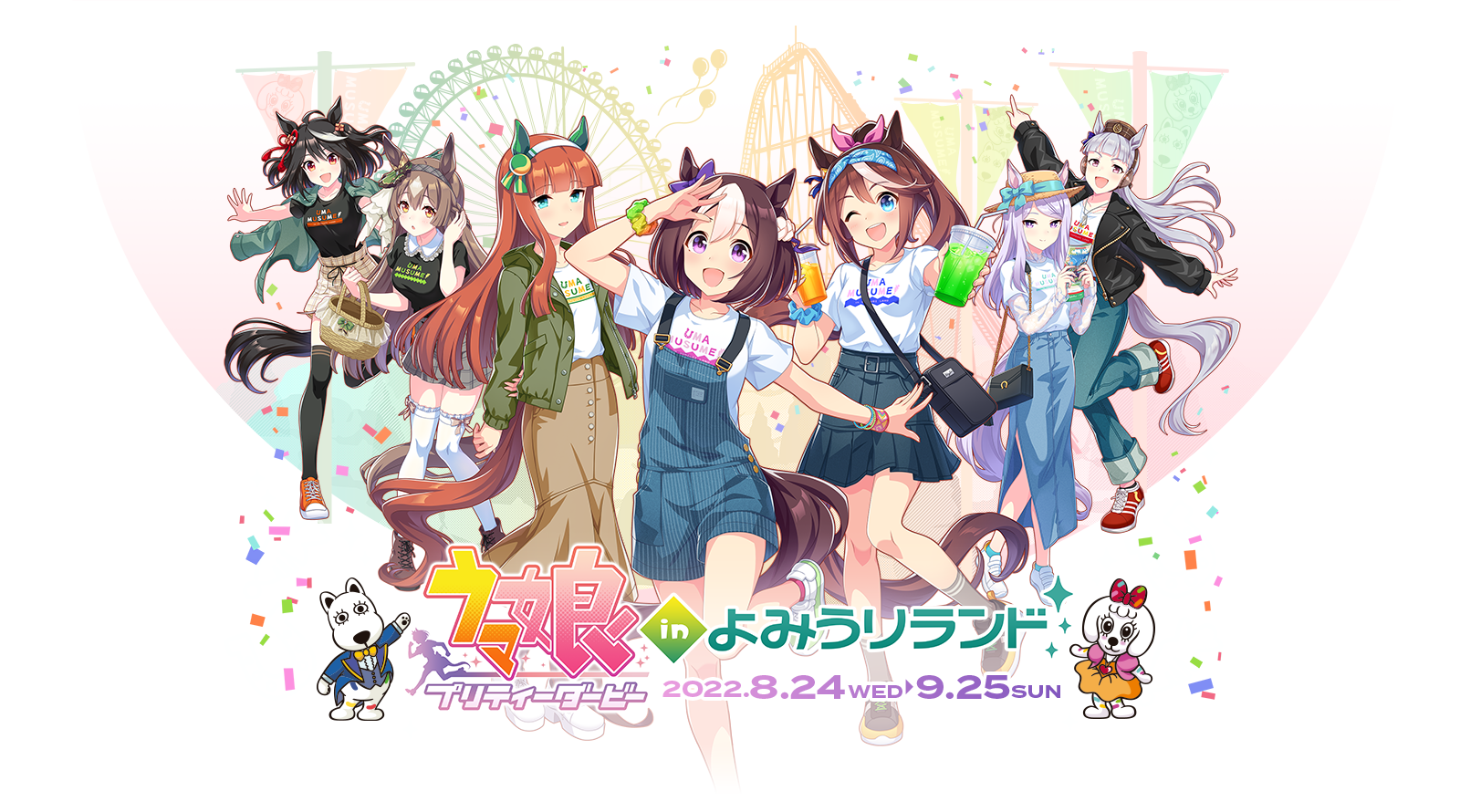 2022 6+girls :d ;d animal_ears aqua_eyes arms_behind_back bag basket black_hair black_jacket black_shirt blue_eyes blue_pants blue_skirt blunt_bangs brown_eyes brown_footwear brown_hair brown_skirt casual clothes_writing commentary_request copyright_name cup denim denim_skirt ear_covers ear_piercing gold_ship_(umamusume) green_jacket grey_hair grey_skirt grey_socks hair_flaps hair_ribbon hairband handbag hat high_ponytail highres hime_cut holding holding_basket holding_cup horse_ears horse_girl horse_tail jacket jacket_on_shoulders jeans kitasan_black_(umamusume) leather leather_jacket leg_up long_hair looking_at_viewer mejiro_mcqueen_(umamusume) multicolored_hair multiple_girls official_alternate_costume official_art one_eye_closed open_mouth orange_hair overalls pants piercing pillbox_hat plaid_clothes plaid_skirt ponytail purple_eyes purple_hair purple_ribbon red_eyes red_footwear ribbon satono_diamond_(umamusume) shirt shoes short_hair silence_suzuka_(umamusume) skirt smile sneakers socks special_week_(umamusume) straw_hat streaked_hair sun_hat swept_bangs t-shirt tail thighhighs tokai_teio_(umamusume) transparent_background two-tone_hair umamusume white_footwear white_hair white_hairband white_shirt white_thighhighs yomiuri_land