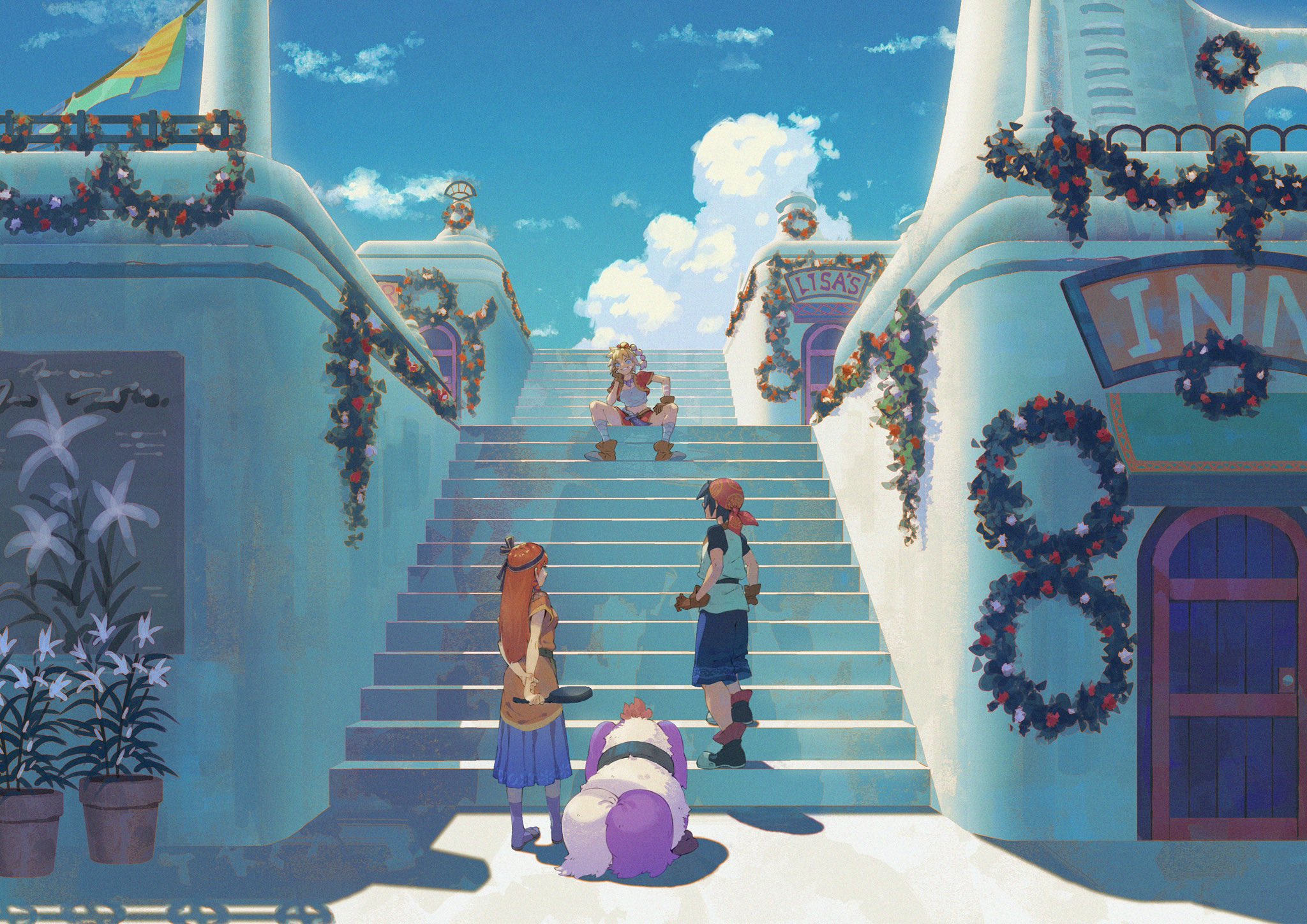 1boy 1other 2girls architecture armor arms_behind_back bandana belt black_skirt blonde_hair blue_eyes blue_hair blue_shorts blue_skirt blue_sky boots breasts brown_footwear brown_gloves brown_tunic chainmail chrono_cross cloud cropped_jacket dagger dog door facial_mark frying_pan gloves grin hair_ribbon hairband hand_on_own_knee highres holding holding_frying_pan jacket kid_(chrono_cross) knife leena_(chrono_cross) long_hair medium_breasts midriff multi-tied_hair multiple_girls orange_hair pinoj0214 ponytail poshul_(chrono_cross) purple_socks red_bandana red_jacket red_ribbon red_skirt ribbon serge_(chrono_cross) shirt short_hair short_sleeves shorts sitting skirt sky smile socks spread_legs stairs standing t-shirt tunic vase weapon white_shirt wreath