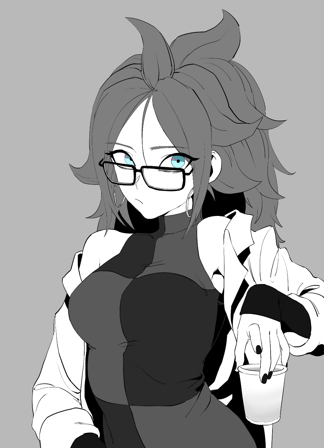 1girl android_21 black_nails blue_eyes checkered_clothes checkered_dress cup disposable_cup dragon_ball dragon_ball_fighterz dragonball_z dress glasses grey_background hair_between_eyes highres lab_coat looking_at_viewer nail_polish solo zequung zquung