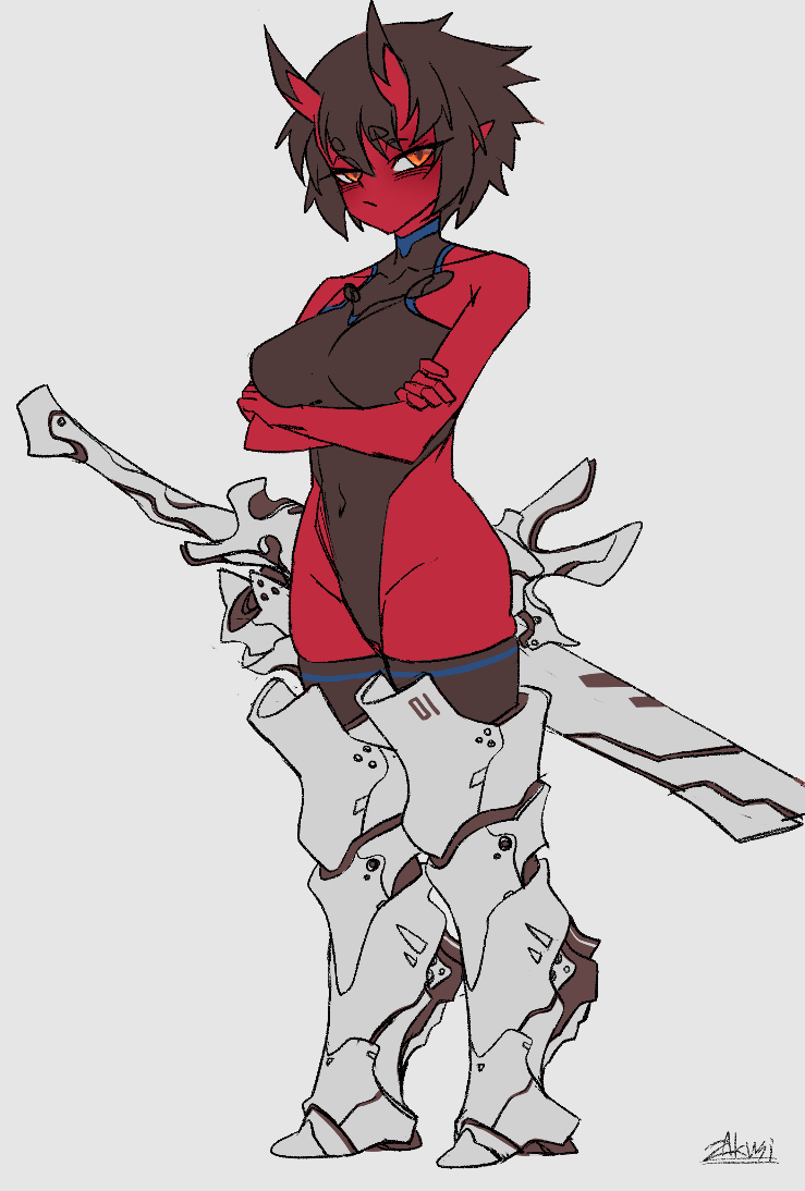 1girl bare_shoulders black_hair black_leotard black_thighhighs breasts closed_mouth colored_skin covered_navel crossed_arms exoskeleton full_body grey_background highleg highleg_leotard horns kidouko_(zakusi) large_breasts leotard looking_at_viewer oni oni_horns orange_eyes original pointy_ears red_oni red_skin short_hair signature simple_background solo sword thighhighs weapon zakusi