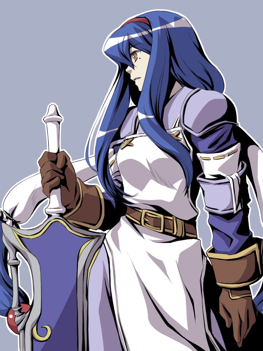 1girl anastasia_valeria argetlahm armor belt blue_hair breasts dress gloves hairband highres long_hair low-tied_long_hair mole mole_under_eye oto_nagi red_hairband simple_background solo sword twintails very_long_hair weapon wild_arms wild_arms_2