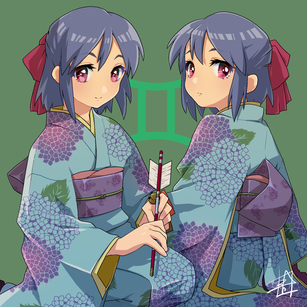 2girls aoiyuya arrow_(projectile) blue_hair blush from_behind frown gemini_(symbol) gemini_(zodiac) hair_ribbon holding holding_arrow japanese_clothes kimono looking_at_viewer looking_back looking_to_the_side multiple_girls obi original pink_eyes ribbon sash short_hair signature smile v-shaped_eyebrows zodiac