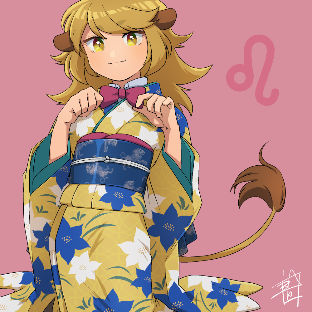 1girl :3 adjusting_bowtie animal_ears aoiyuya blonde_hair blush bow bowtie clematis_(flower) flower japanese_clothes kimono leo_(symbol) leo_(zodiac) lion_ears lion_girl lion_tail long_hair looking_at_viewer obi original sash signature slit_pupils solo tail traditional_bowtie v-shaped_eyebrows wide_sleeves yellow_eyes zodiac
