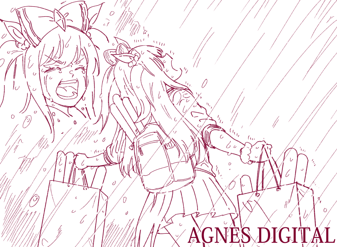 agnes_digital_(umamusume) animal_ears bag casual character_name comiket_100 commentary_request crying horse_ears horse_girl horse_tail looking_up meme monochrome open_mouth outstretched_arms parody rain spread_arms taguchi_kenji_(omaep) tail umamusume