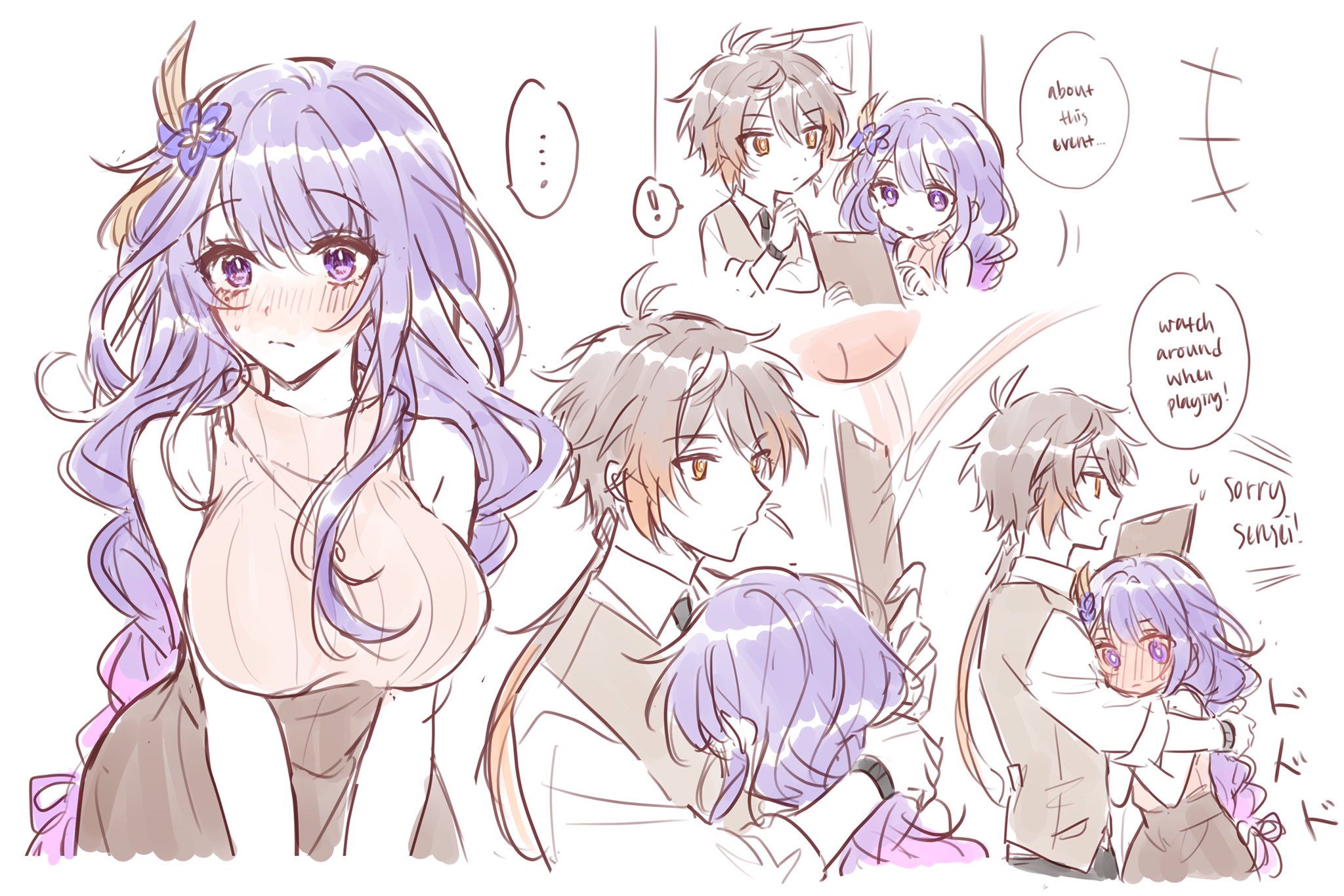 ! ... 1boy 1girl alternate_costume blush braid breasts bright_pupils brown_hair brown_vest clipboard closed_mouth commentary earrings enefue english_commentary eyelashes full-face_blush genshin_impact gradient_hair hair_ornament highres holding holding_clipboard hug jewelry large_breasts long_hair long_sleeves low-braided_long_hair low-tied_long_hair low_ponytail mole mole_under_eye multicolored_hair orange_eyes orange_hair ponytail purple_eyes purple_hair raiden_shogun shirt sidelocks single_earring sketch spoken_ellipsis sweatdrop tassel tassel_earrings vest white_pupils white_shirt zhongli_(genshin_impact)