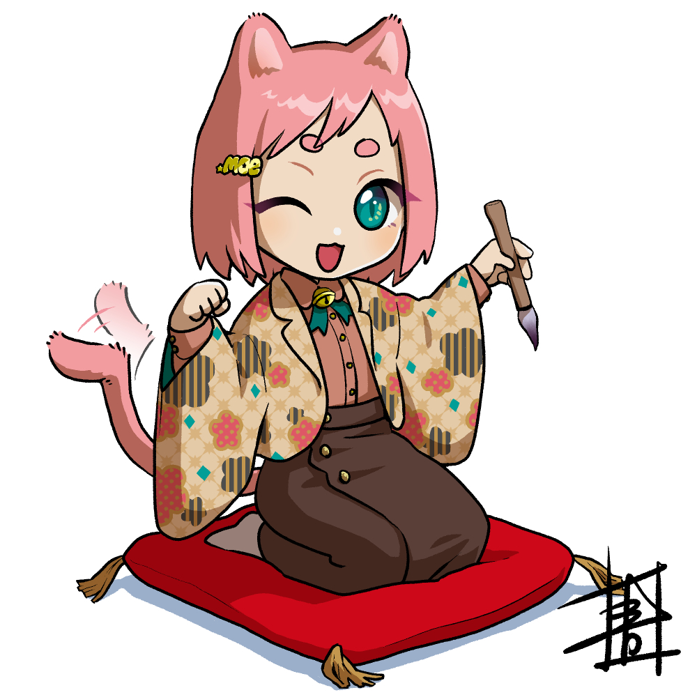 1girl :3 :d animal_ears aoiyuya bell blush calligraphy_brush cat_ears cat_girl cat_tail collared_shirt green_eyes hair_ornament hairclip holding holding_paintbrush japanese_clothes long_sleeves neck_bell neck_ribbon one_eye_closed open_mouth original paintbrush paw_pose pencil_skirt pillow pink_hair ribbon seiza shirt shirt_tucked_in short_hair sitting skirt slit_pupils smile solo tail tail_wagging thick_eyebrows wide_sleeves