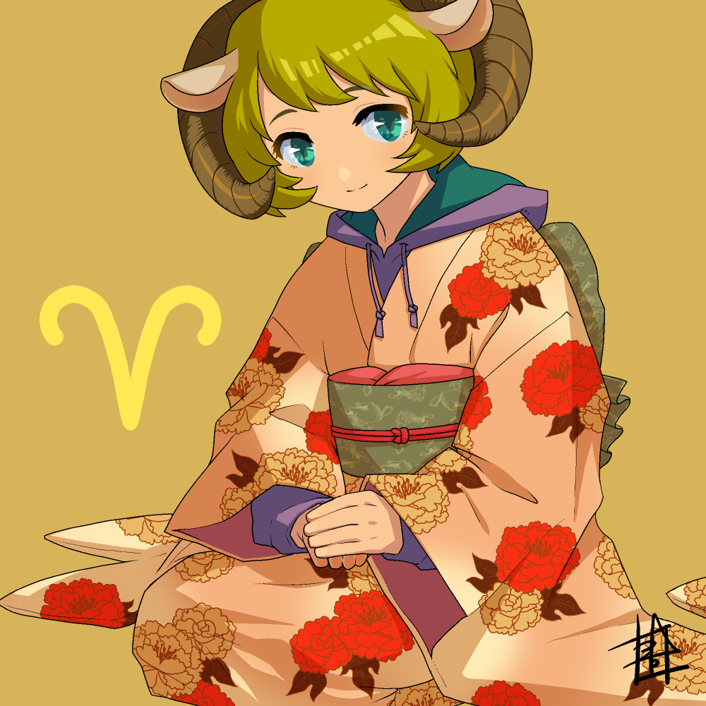 1girl animal_ears aoiyuya aries_(symbol) aries_(zodiac) blonde_hair blush floral_print green_eyes hood hoodie horns japanese_clothes kimono layered_clothes long_sleeves obi original own_hands_together peony_print sash sheep_ears sheep_horns short_hair sitting smile solo wide_sleeves yokozuwari zodiac