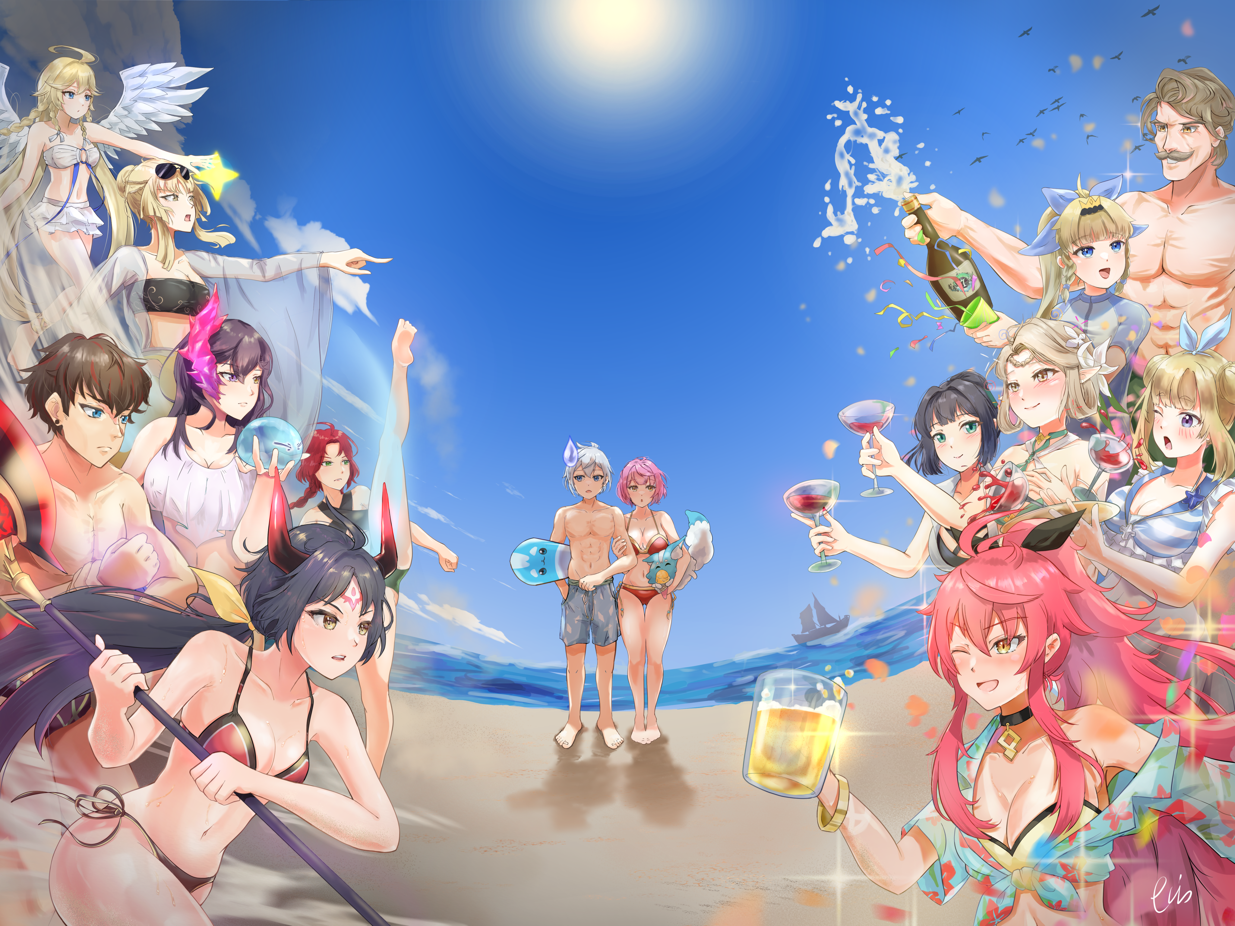 4boys 6+girls absurdres alexa_(epic_seven) angel_of_light_angelica_(epic_seven) apocalypse_ravi_(epic_seven) arkasus beach beer_mug bikini bird blonde_hair blue_eyes blue_male_swimwear blue_swim_trunks blush boat braid brown_eyes brown_hair cermia_(epic_seven) cermia_(swimsuit_cermia)_(epic_seven) champagne_bottle charles_(epic_seven) choker conqueror_lilias_(epic_seven) cup double_bun drink drinking_glass earrings elf epic_seven eyewear_on_head facial_hair facial_mark fallen_cecilia_(epic_seven) feathered_wings flower forehead_mark green_eyes grey_hair hair_bun hair_flower hair_ornament heterochromia highres holding holding_drink holding_weapon horns hwayoung_(epic_seven) ice_cream_cone iseria_(epic_seven) jewelry male_swimwear mediator_kawerik_(epic_seven) mercedes_(epic_seven) montmorancy_(epic_seven) mug multiple_boys multiple_girls mustache one_eye_closed party_popper pointy_ears prince_aither purple_eyes rass_elclare red_hair sunglasses swim_trunks swimsuit tinkst watercraft weapon wine_glass wings yellow_eyes