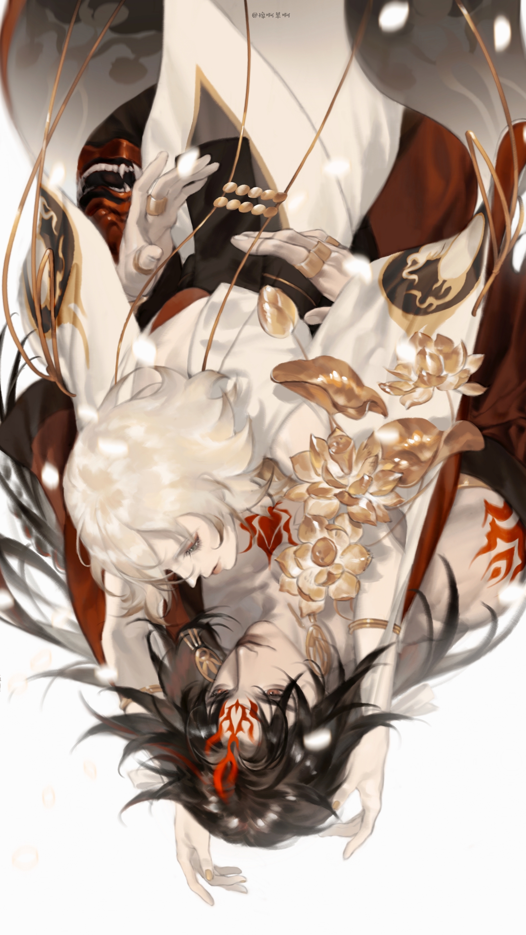 2boys absurdres asura_(onmyoji) bare_pectorals bishounen black_hair blonde_hair dark_skin facial_mark highres japanese_clothes jewelry long_hair male_focus multicolored_hair multiple_boys onmyoji pectorals short_hair taishakuten_(onmyoji) two-tone_hair xiangaguoa yaoi