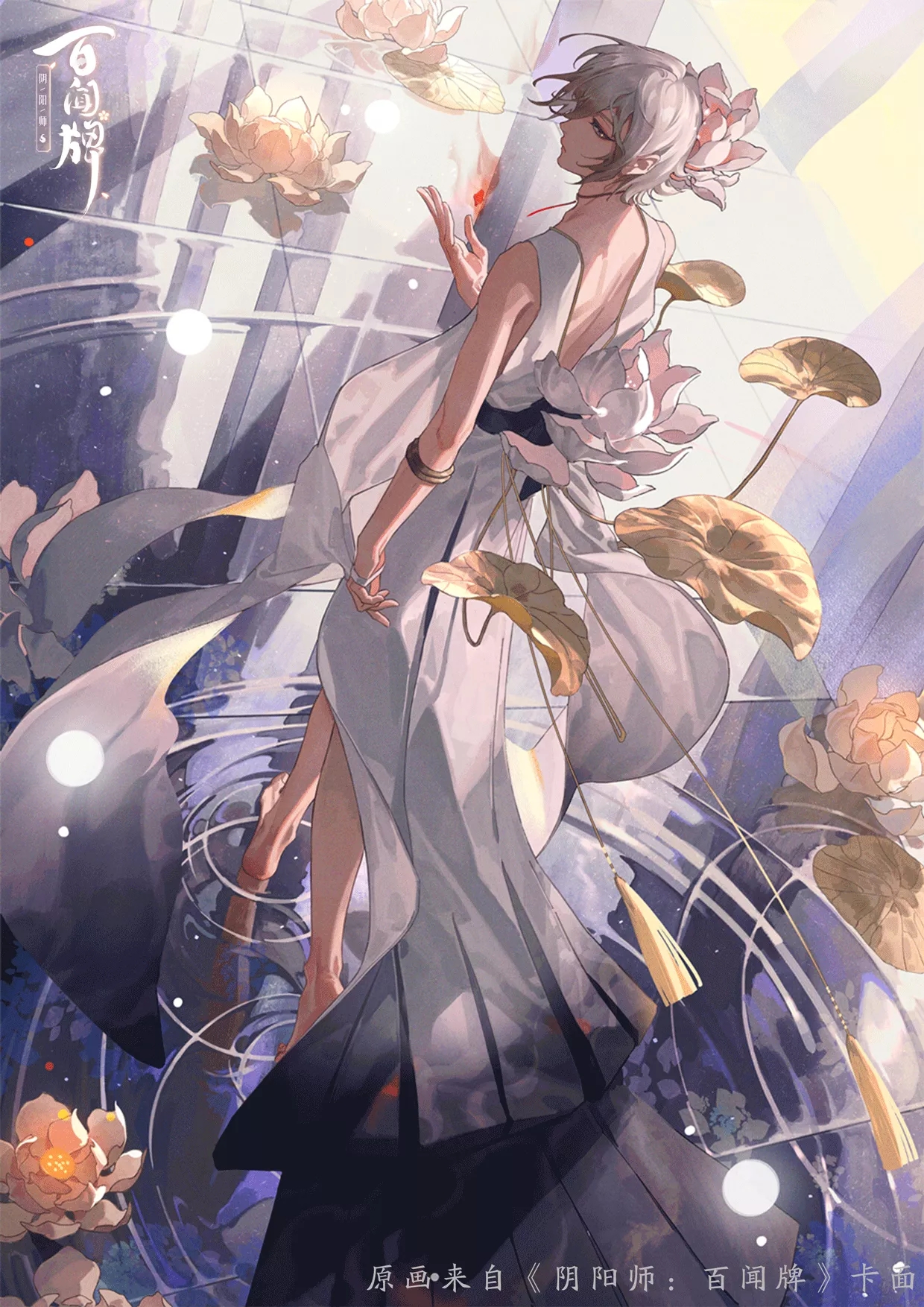 1boy back bishounen dutch_angle fire flower flower_on_liquid from_side full_body full_moon highres japanese_clothes lotus male_focus moon onmyoji profile short_hair solo taishakuten_(onmyoji) tassel vapourwinters wading